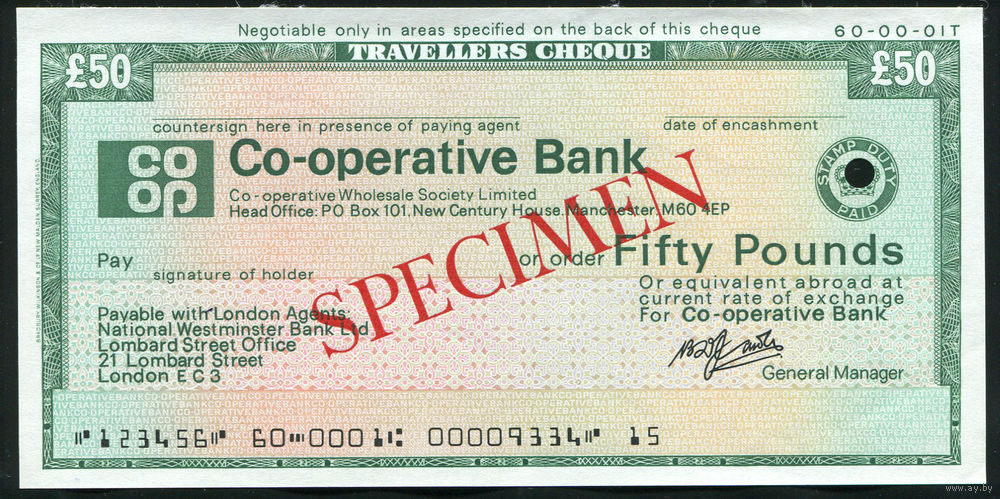 Дорожный чек Образец 50 фунтов стерлингов Банк Co-operative Bank Англия