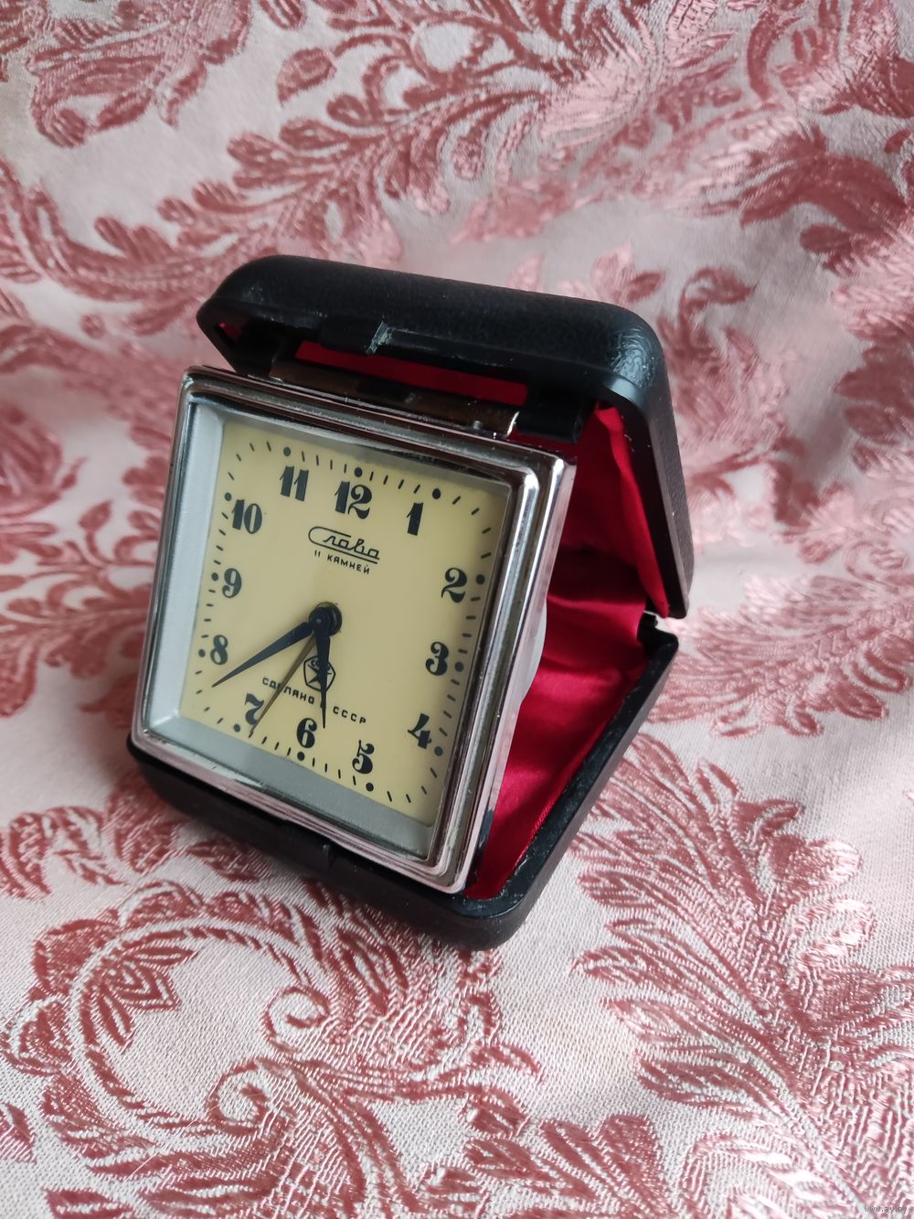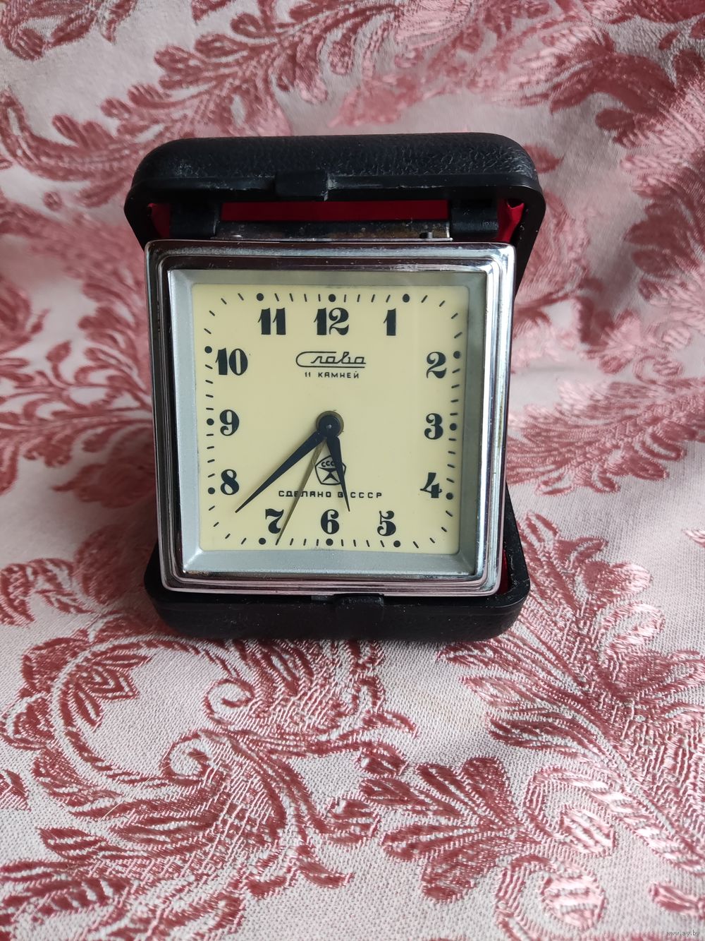 Дорожный коллекционный будильник Слава. 80-е годы. Рабочий. Корпус пластик, шелковая подкладка. Уверенный ход, громкий звук. Обслужен.