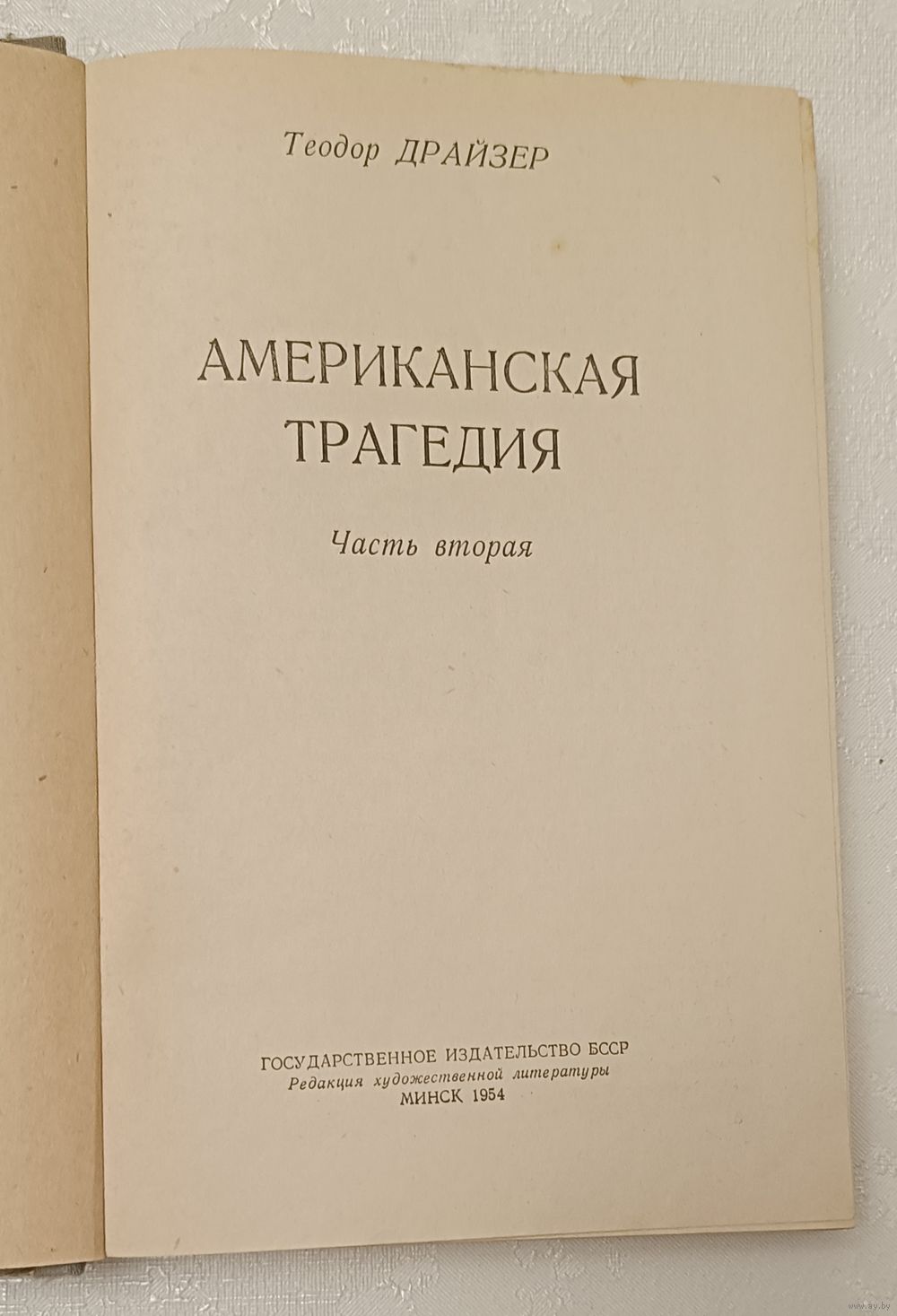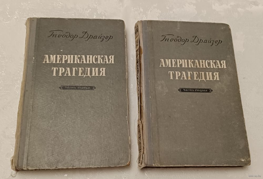 Драйзер Теодор. Американская трагедия (комплект из 2 книг). Государственное издательство БССР, редакция художественной литературы, Минск, 1954, стр. 376+ 389, твердый переплет."Американская трагедия" - самое известное произведение выдающегося американского писателя Т.Драйзера. Как и во всех своих романах, Драйзер в "Американской трагедии" даёт широкую картину нравов и быта изображаемой им среды. Сущность трагедии Грифитса, кончающего свою жизнь на электрическом стуле, его социальная неприспособленность к окружающей действительности, сочетающаяся со стремлением выдвинуться, занять исключительное положение, войти в буржуазные круги.