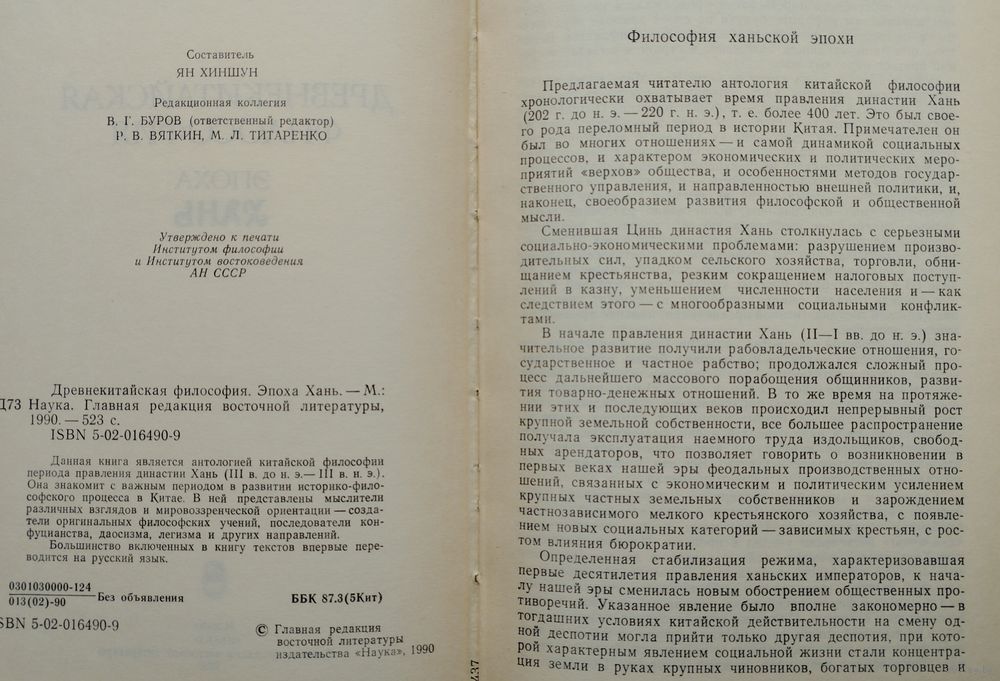 Большой формат. Тираж 10000 экз. 528 стр. Данная книга является антологией китайской философии периода правления династии Хань (III в. до н. э.— III в. н. э.). Она знакомит с важным периодом в развитии историко-философского процесса в Китае. В ней представлены мыслители различных взглядов и мировоззренческой ориентации — создатели оригинальных философских учений, последователи конфуцианства, даосизма, легизма и других направлений. Большинство включенных в книгу текстов впервые переводится на русский язык.