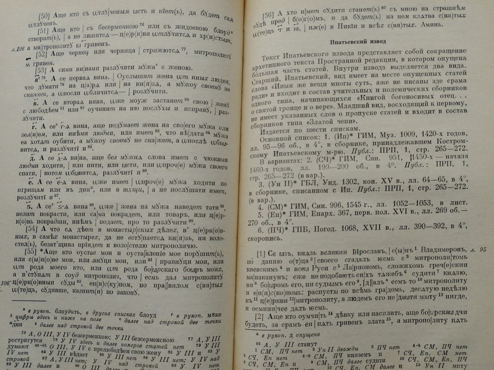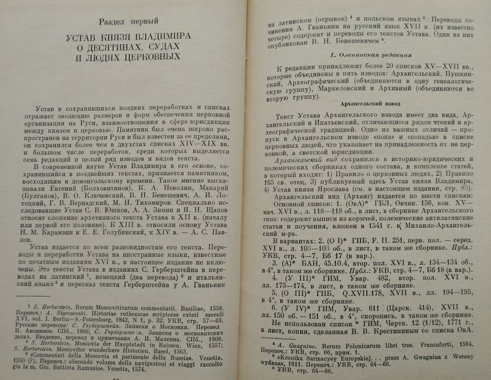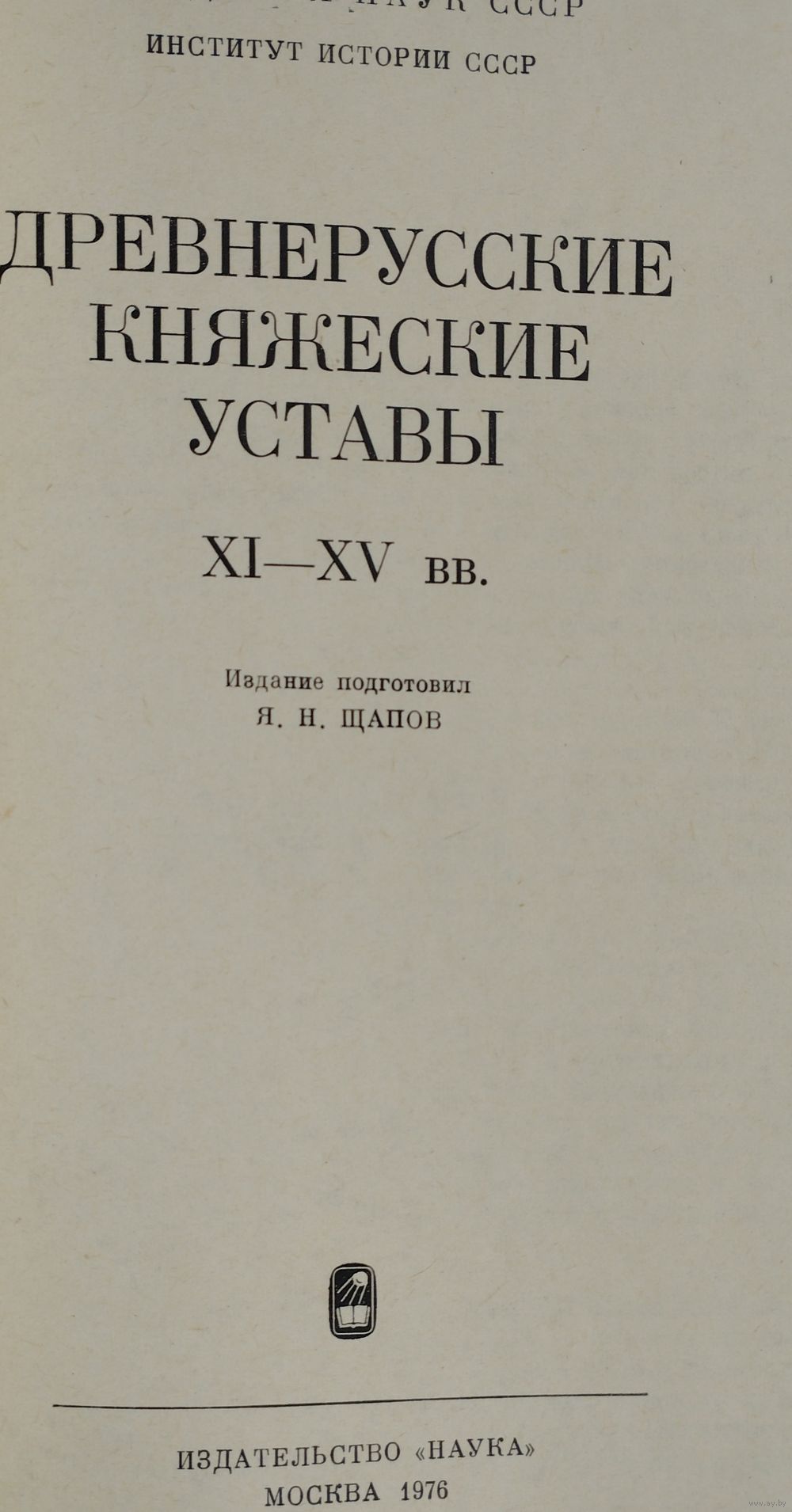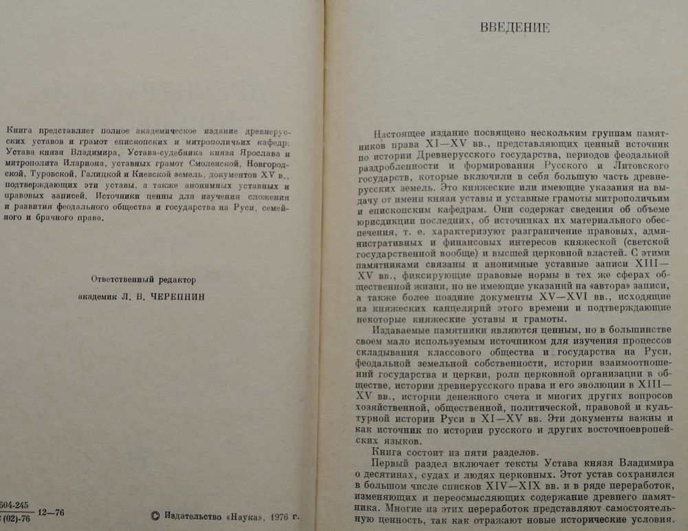 Большой формат. Ляссе. Тираж 10400 экз. 248 стр. Книга представляет собой полное академическое издание древнерусских уставов и грамот епископских и митрополичьих кафедр: Устава князя Владимира, Устава-судебника князя Ярослава и митрополита Иллариона, уставных грамот Смоленской, Новгородской, Туровской, Галицкой и Киевской земель, документов XV в., подтверждающих эти уставы, а также анонимных уставных и правовых записей.