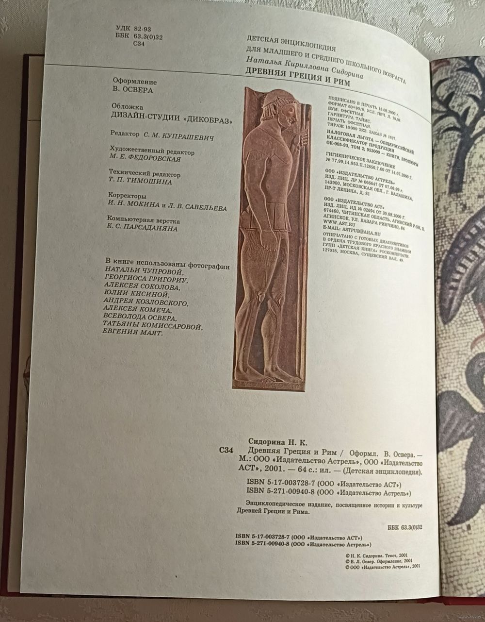 Сидорина Н. К. Древняя Греция и Рим. М.: ООО «Издательство Астрель», ООО «Издательство АСТ, 2001. — 64 с.: ил. (Детская энциклопедия), твёрдый переплёт, энциклопедический формат.