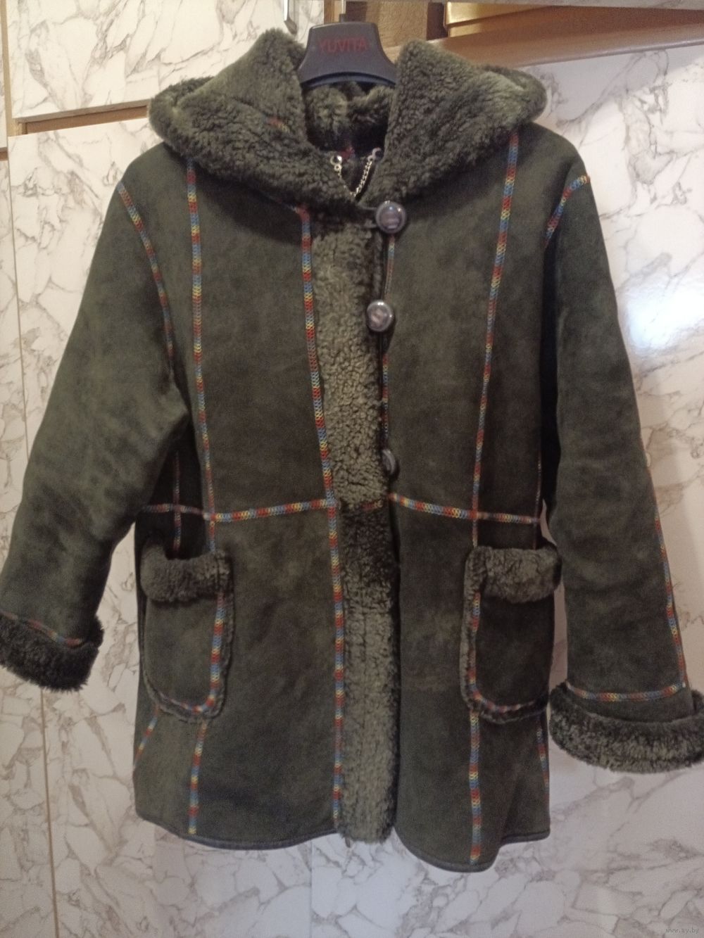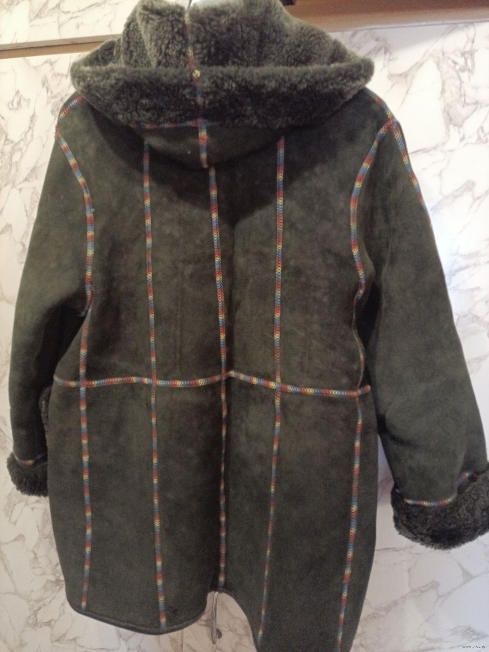 Отличное качество, не тяжёлая, с капюшоном, застёжка на пуговицах, красивый темно-зеленый цвет. Длина по спинке 63 см. Длина рукава 50-54 см.(С отворотом и без него)