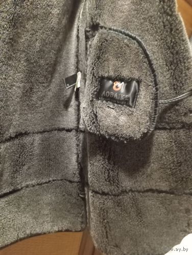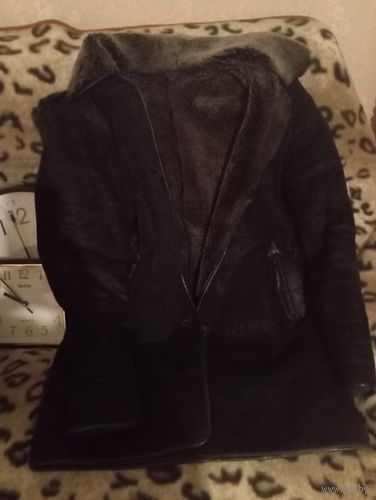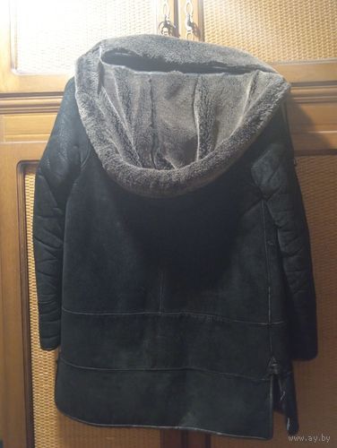 Дублёнка натуральная женская с капюшоном, цвет черный. Нет одной пуговицы спереди. Длина - 85 см, полуобхват бедер - 55 см, рукав от плеча - 80 см.