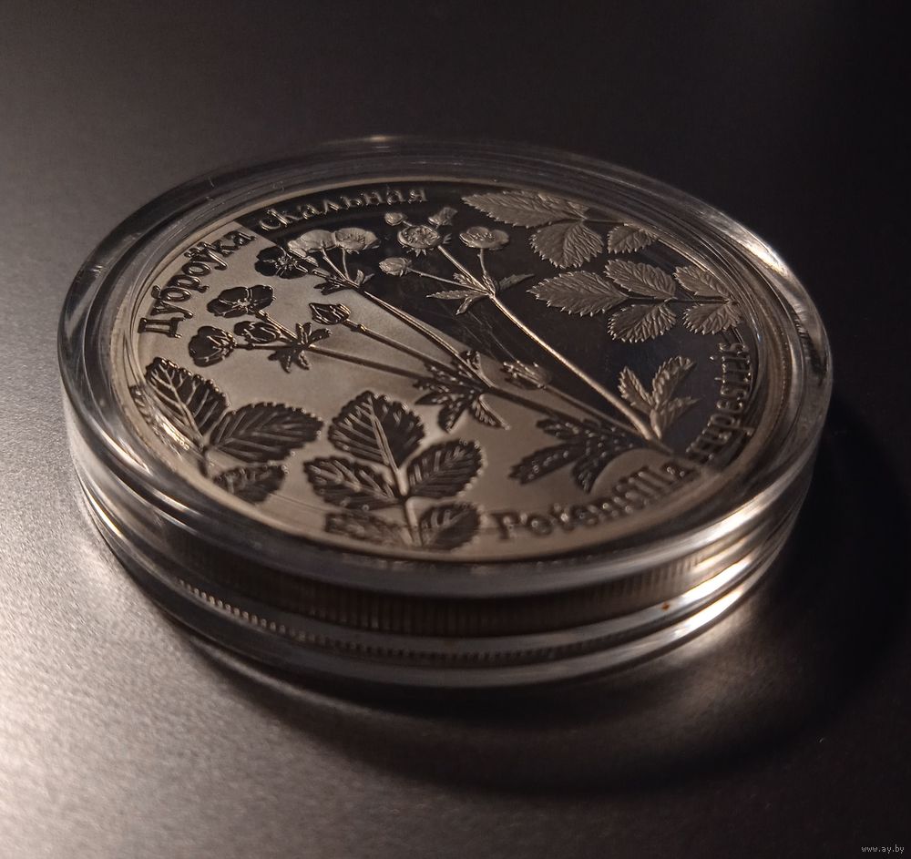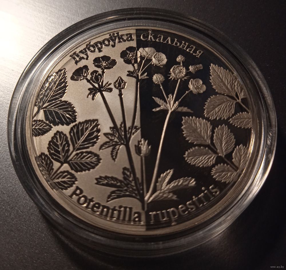 в центре – рельефное декоративное изображение растения лапчатки скальной, справа и слева от которого крупным планом изображены фрагменты этого растения; по кругу надписи: внизу –"Potentilla rupestris", вверху – "Дуброўка скальная".