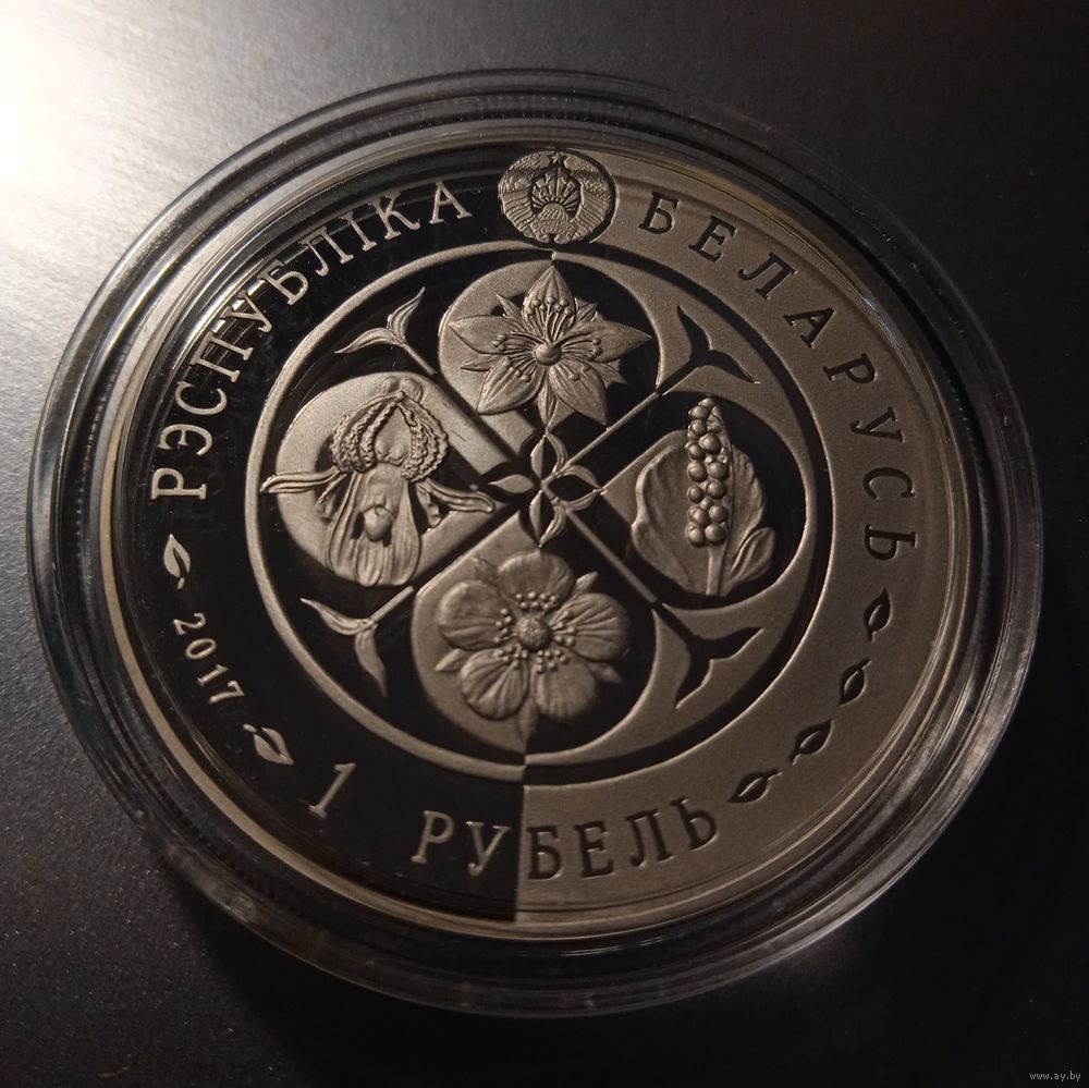 вверху – рельефное изображение Государственного герба Республики Беларусь, по кругу надпись: РЭСПУБЛІКА БЕЛАРУСЬ; в центре в круге – декоративная композиция в форме цветка с четырьмя лепестками, на которой изображены растения, входящие в данную серию; внизу – номинал: 1 РУБЕЛЬ (на медно-никелевой); слева от номинала – год чеканки.