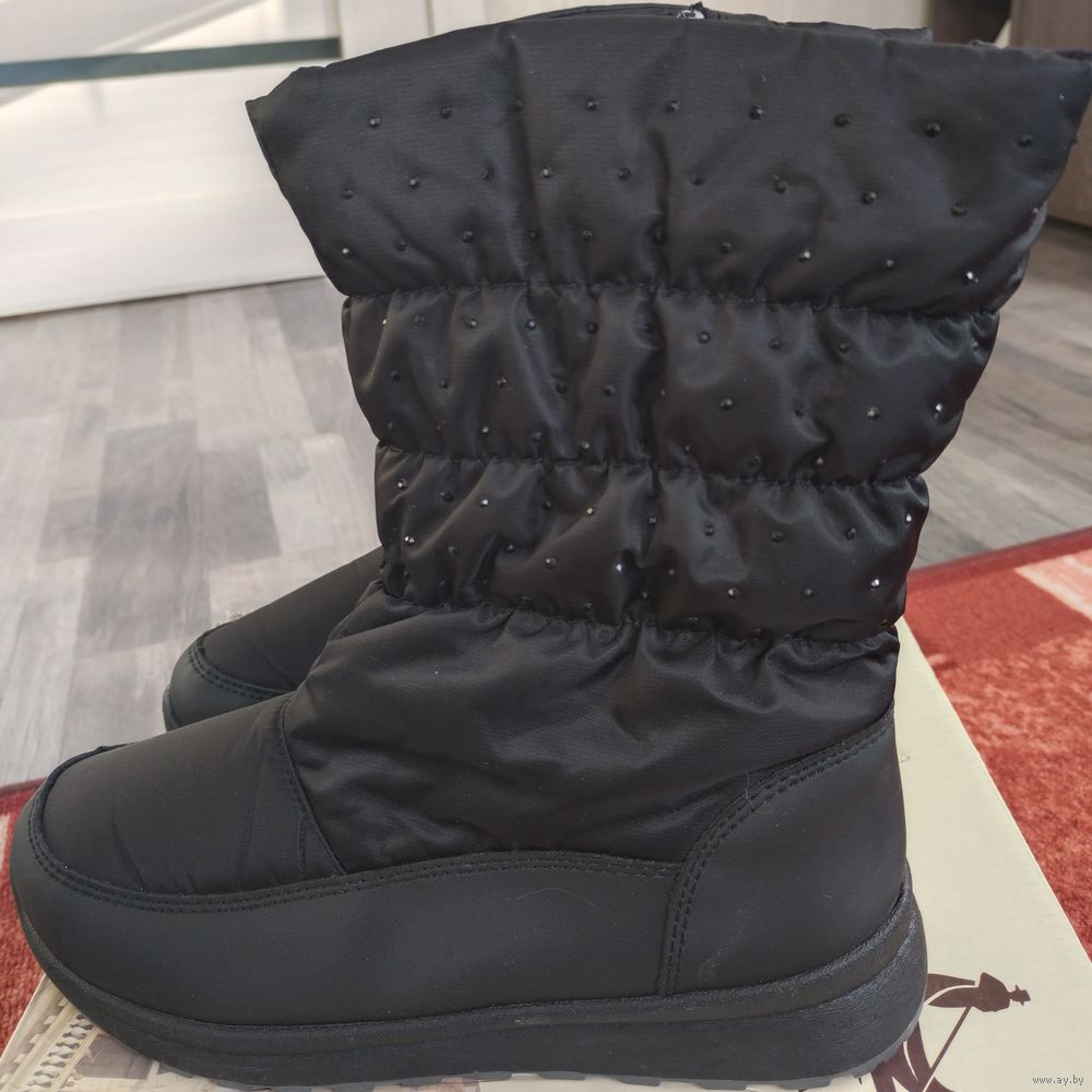 Новые, есть коробка и этикетка. Верх - искусственная кожа и текстиль, внутри искусственный мех, плотный. Подошва - ПВХ. Полнота G7, высота голенища 19 см, обхват голенища 28 см. Удобные, но мне широки в голенище, на плотную ножку.