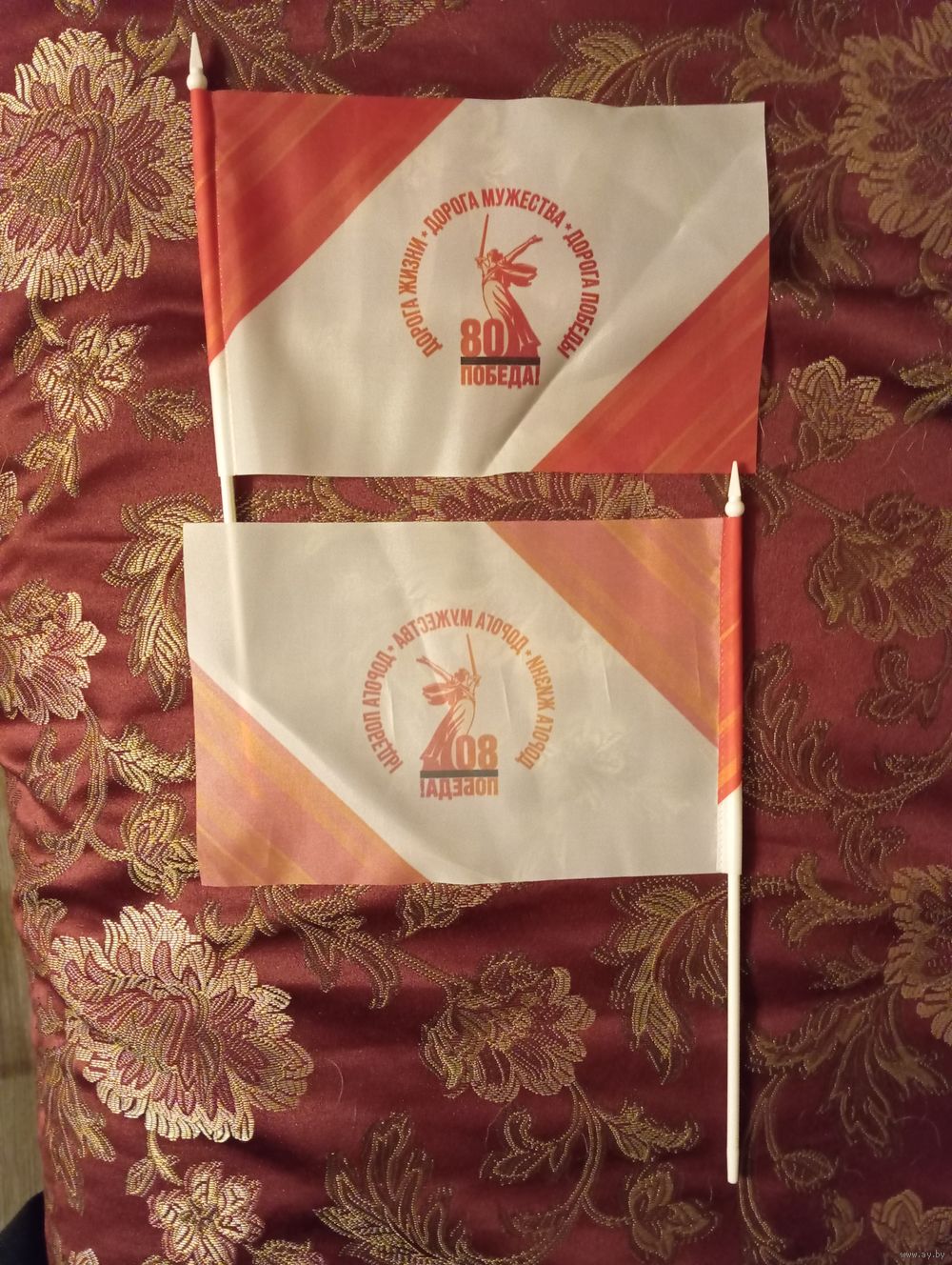 Эти флажки являются сувенирной продукцией, посвященной 80-летию Победы в Великой Отечественной войне. На полотне изображены стилизованный логотип и надпись «ДОРОГА МУЖЕСТВА. 80 ПОБЕДА!», а также обрамляющая надпись «ДОРОГА ЖИЗНИ • ДОРОГА МУЖЕСТВА • ДОРОГА ПАМЯТИ».