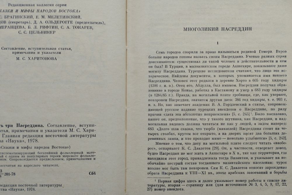 Семь городов спорили за право называться родиной Гомера. Втрое больше народов готовы назвать своим Насреддина. Ученые разных стран доискиваются: существовал ли такой человек в действительности и кем он был? В Турции, в малоазиатском городе Акшехире, показывают даже могилу Насреддина. Турецкие исследователи считают, что лицо это историческое. Найдены документы, в которых упоминается имя некоего Насреддина. Человек этот родился в деревне Хорто в 605 году хиджры (1206 г. н. э.). Отец его, Абдулла, был имамом. Насреддин получил образование в городе Конье, работал в Кастамону и умер в 683 году хиджры (в 1284/85 г.). Правда, на могильной плите гробницы, где, как уверяют, похоронен Насреддин, значится другая дата: 386 год хиджры, т. е. 993 г. н. э. Но, как замечает академик В. А. Гордлевский в статье, сопровождающей русское издание турецких анекдотов о Насреддине, по ряду причин «дата эта абсолютно неприемлема» [5, с. 245] К Было высказано, пишет он, предположение, что у такого шутника, как Насреддин, и надмогильная надпись должна читаться не как у людей, а задом наперед: 683. «Долго шла сказка, что тюрбэ (мавзолей) Насреддина стоит на четырех столбах, кругом все открыто, а на дверях висят два больших деревянных замка, и кто проходит мимо — невольно улыбнется»