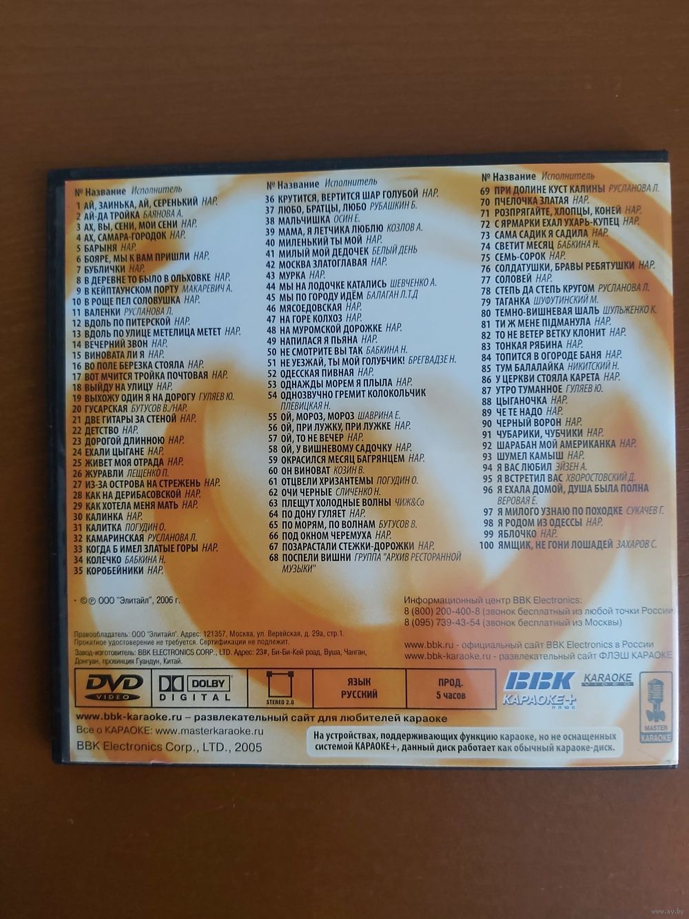 DVD диск Любимые застольные 100 песен, караоке+, 2006г.