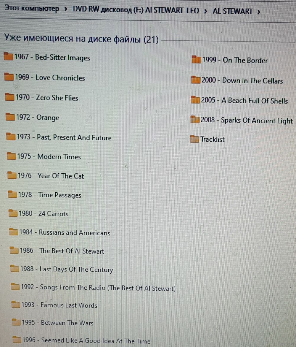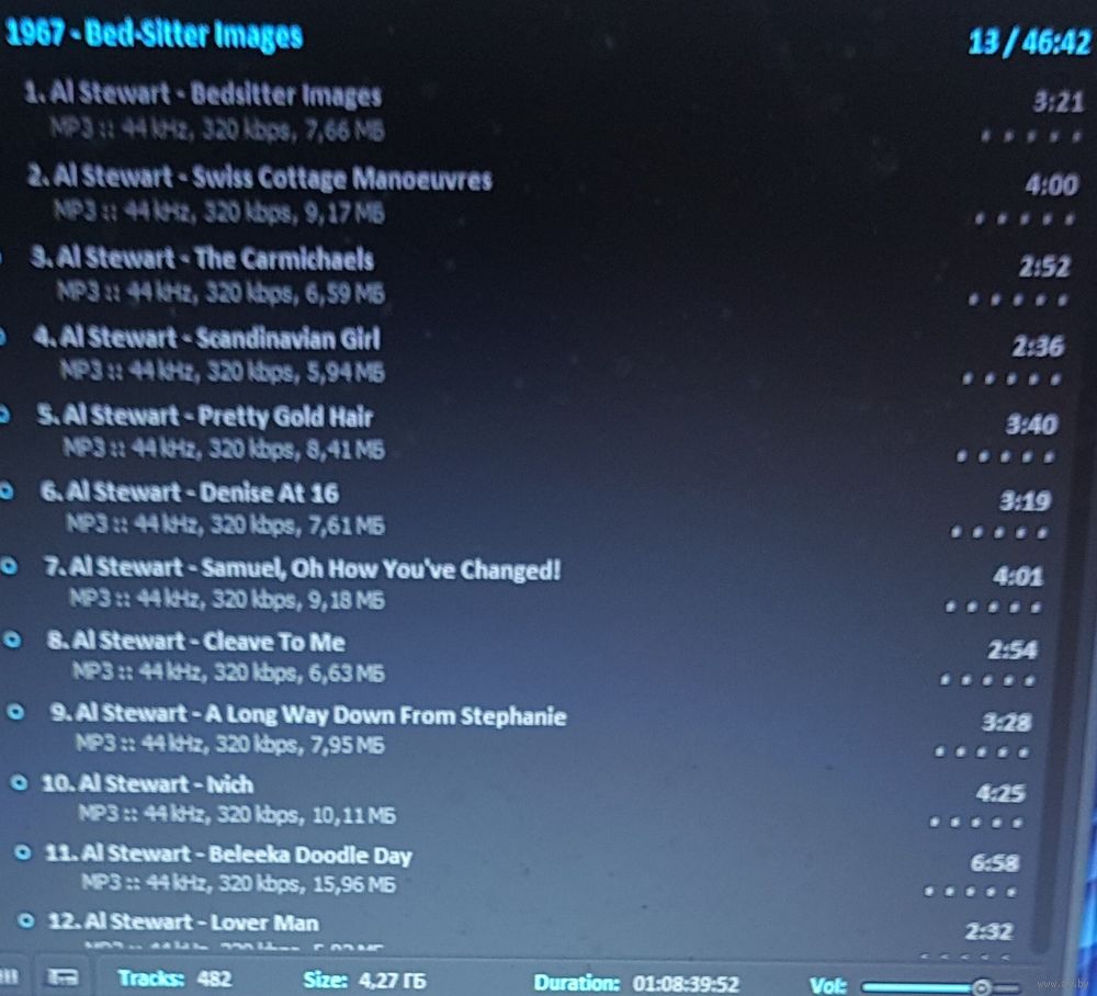 Контент см. фото конверта и скриншотов с экрана. При наличии таковых в треки вшиты обложки альбомов. Качество 320 kbps (если напротив названия альбома не указано иное). Покупателям, совершившим покупки на сумму от 50 до 100 руб. скидка 5%, от 101 до 200 руб. - 10%, более 201 руб. - 20%. Заказы на сумму менее 5 руб. с 2024 г. не высылаю. Ознакомиться с творчеством можно здесь: https://musify.club/artist/al-stewart-41715/releases; https://musify.club/artist/leo-sayer-2124/releases