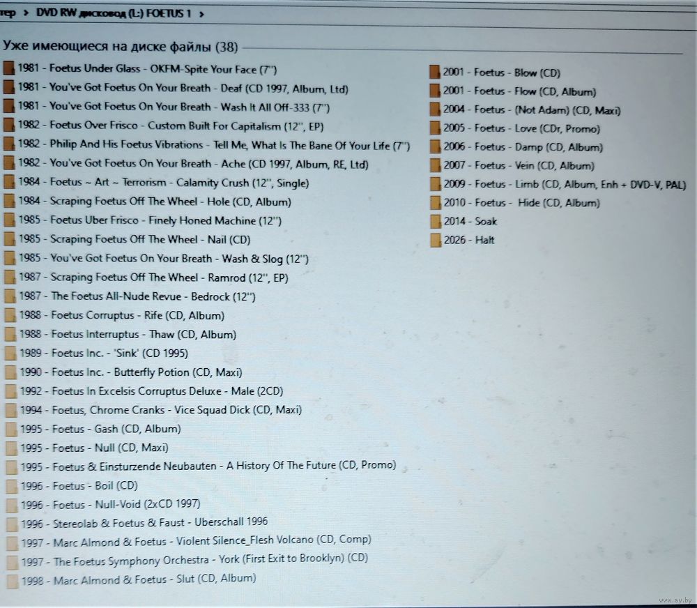 Контент см. фото конверта. При наличии таковых в треки вшиты обложки альбомов. Качество 320 kbps (если напротив названия альбома не указано иное). Покупателям, совершившим покупки на сумму от 50 до 100 руб. скидка 5%, от 101 до 200 руб. - 10%, более 201 руб. - 20%. Заказы на сумму менее 5 руб. с 2024 г. не высылаю. Ознакомиться с творчеством можно здесь: https://musify.club/artist/foetus-20023/discography