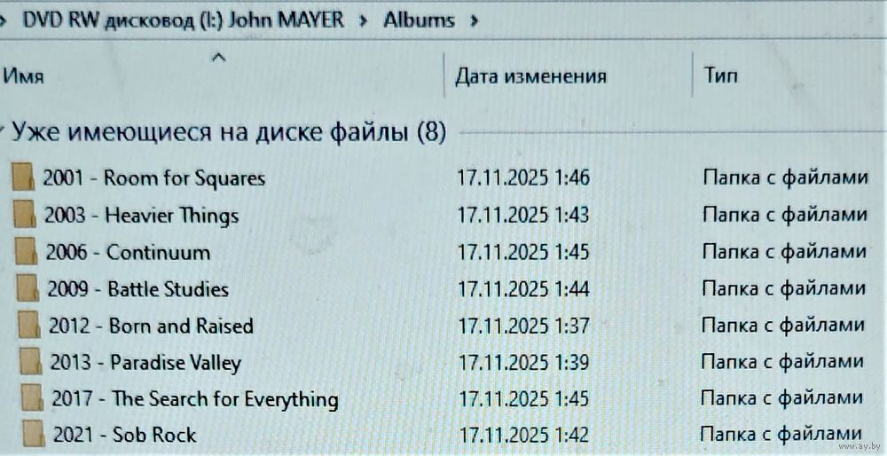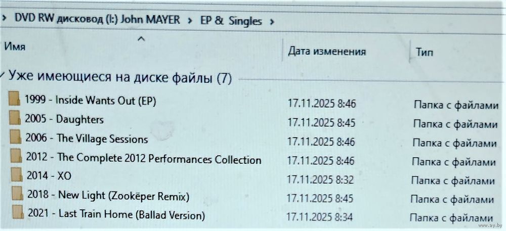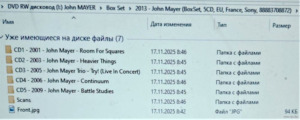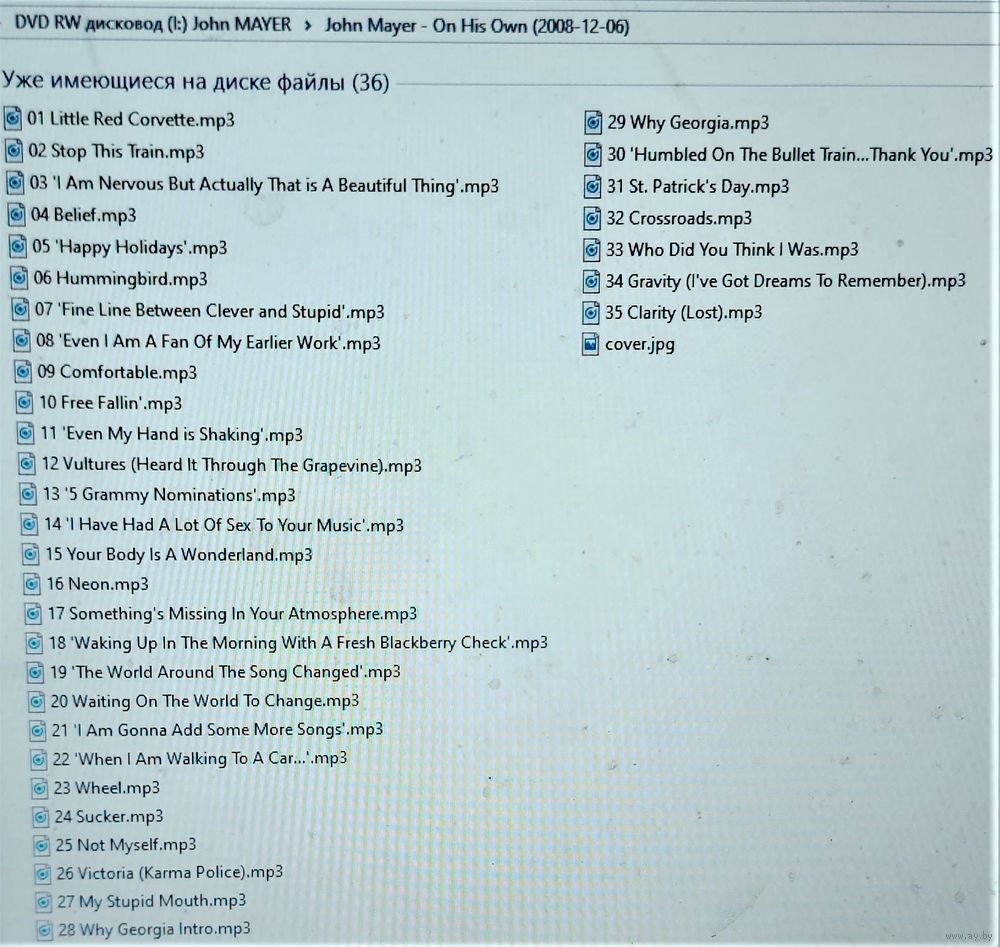 Контент см. фото конверта и скриншотов с экрана. При наличии таковых в треки вшиты обложки альбомов. Качество 320 kbps (если напротив названия альбома не указано иное). Покупателям, совершившим покупки на сумму от 50 до 100 руб. скидка 5%, от 101 до 200 руб. - 10%, более 201 руб. - 20%. Заказы на сумму менее 5 руб. с 2024 г. не высылаю. Ознакомиться с творчеством можно здесь: https://musify.club/artist/john-mayer-1277/discography