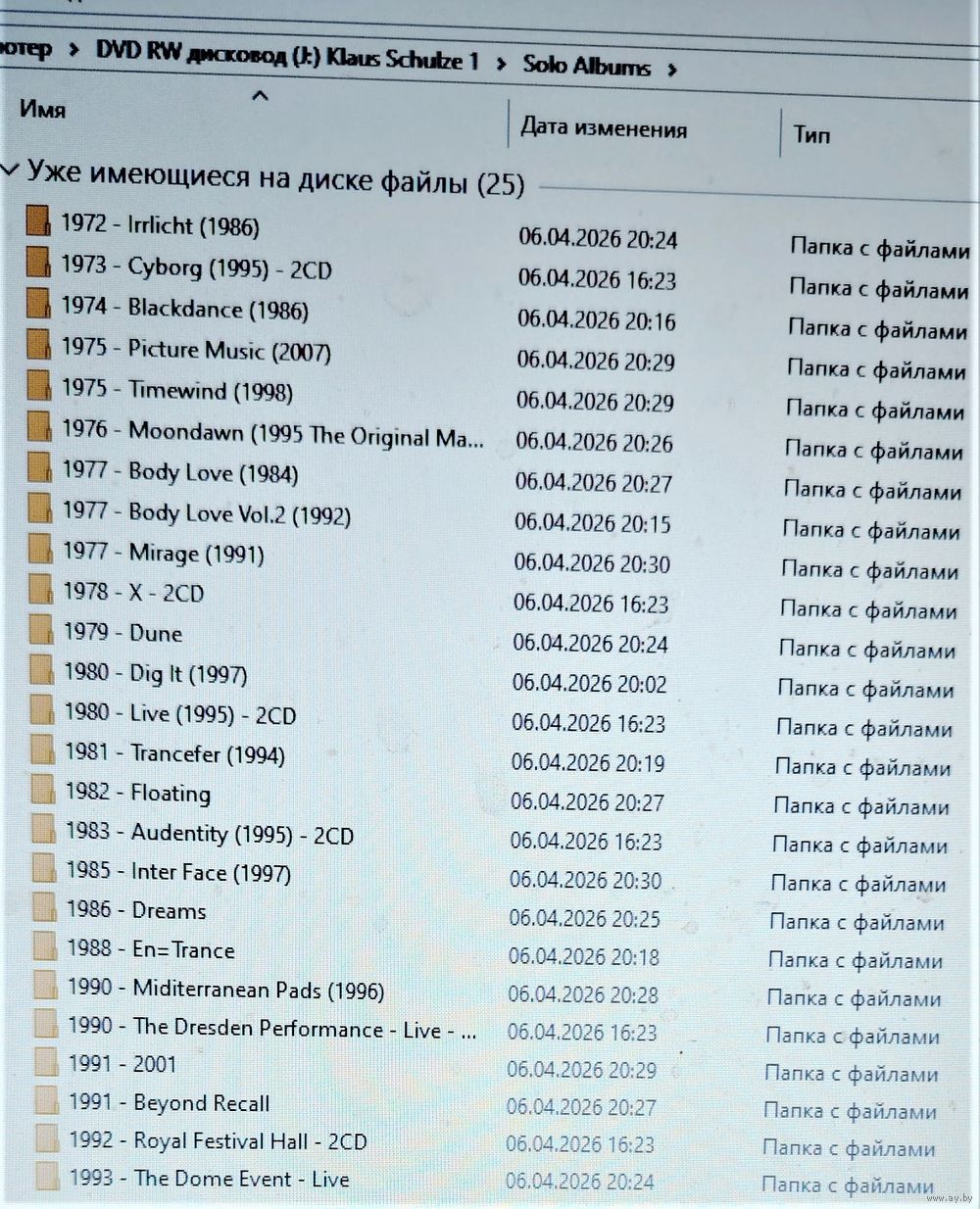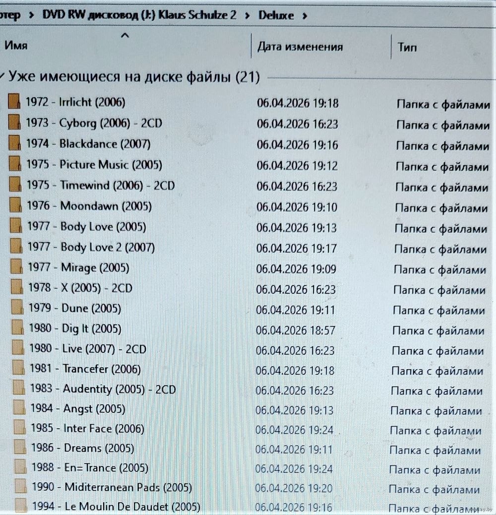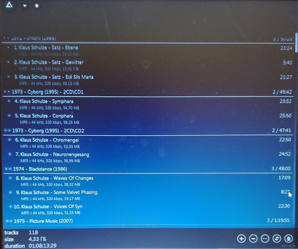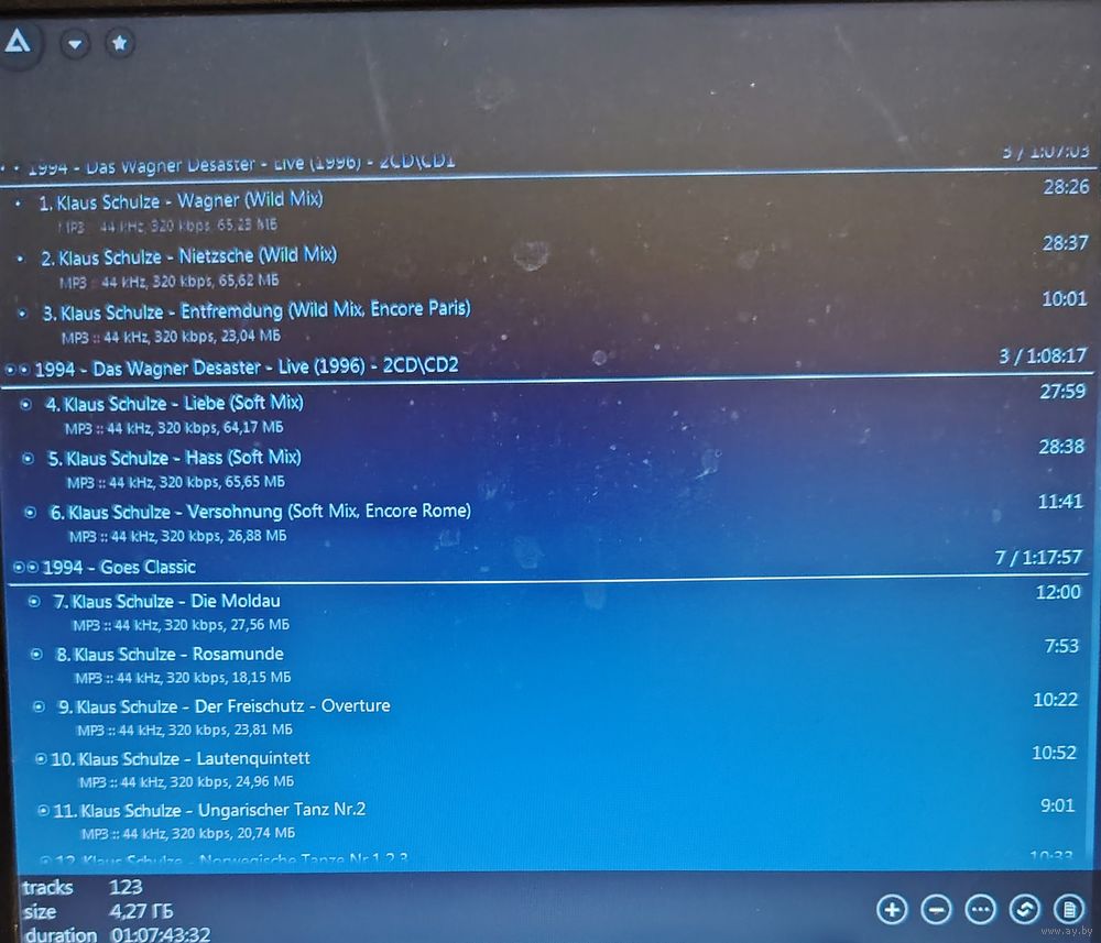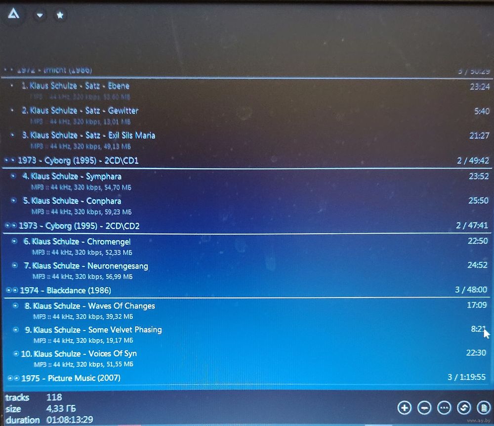 Контент см. фото конверта и скриншотов с экрана. При наличии таковых в треки вшиты обложки альбомов. Качество 320 kbps (если напротив названия альбома не указано иное). Покупателям, совершившим покупки на сумму от 50 до 100 руб. скидка 5%, от 101 до 200 руб. - 10%, более 201 руб. - 20%. Заказы на сумму менее 5 руб. с 2024 г. не высылаю. Ознакомиться с творчеством можно здесь: https://musify.club/artist/klaus-schulze-34881/discography