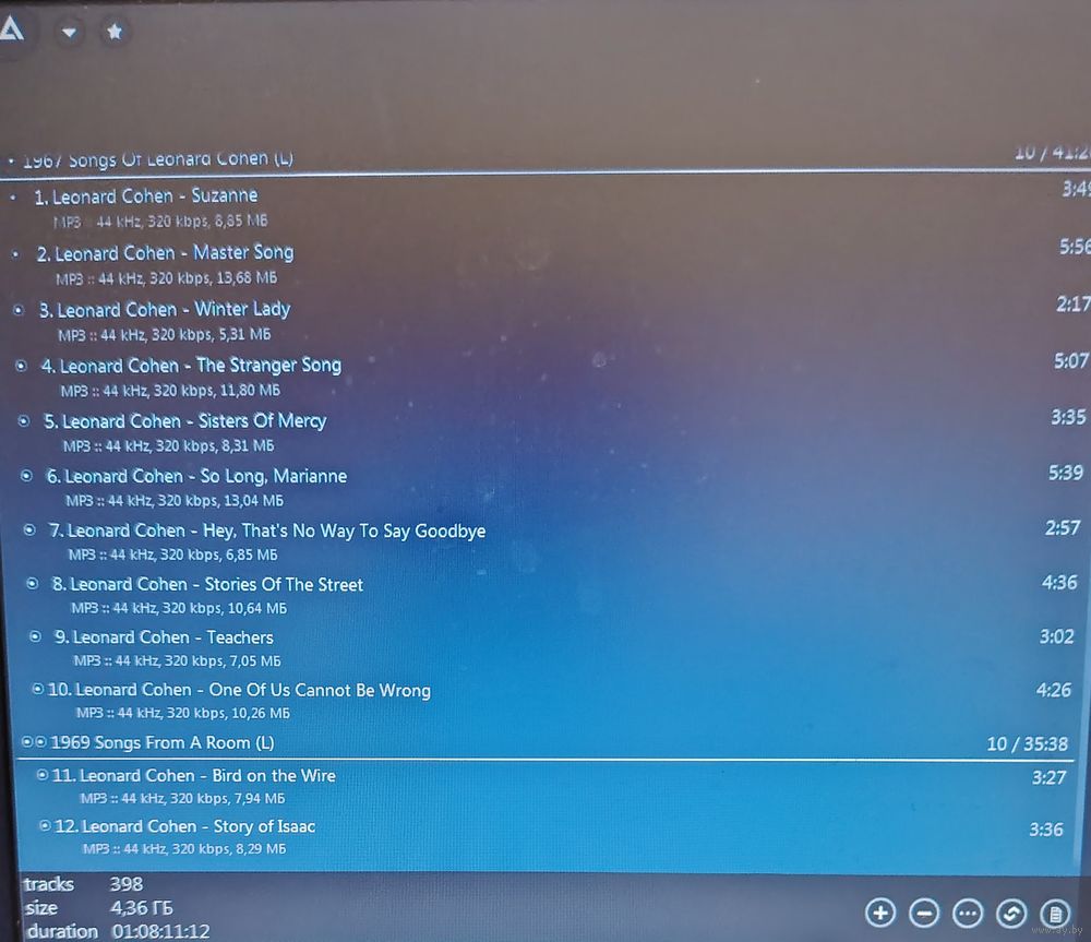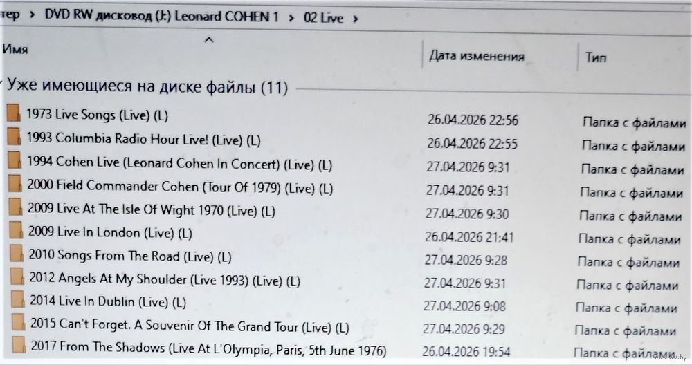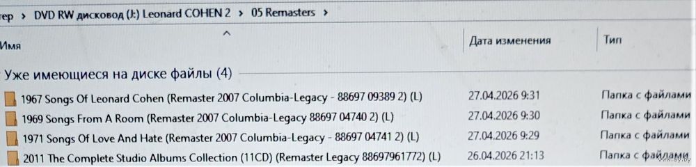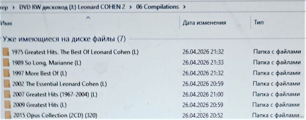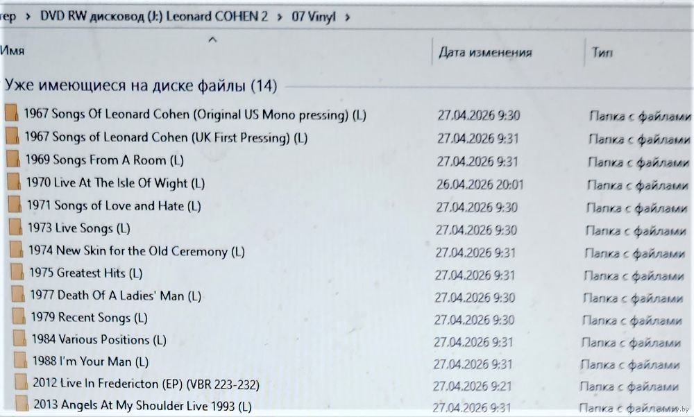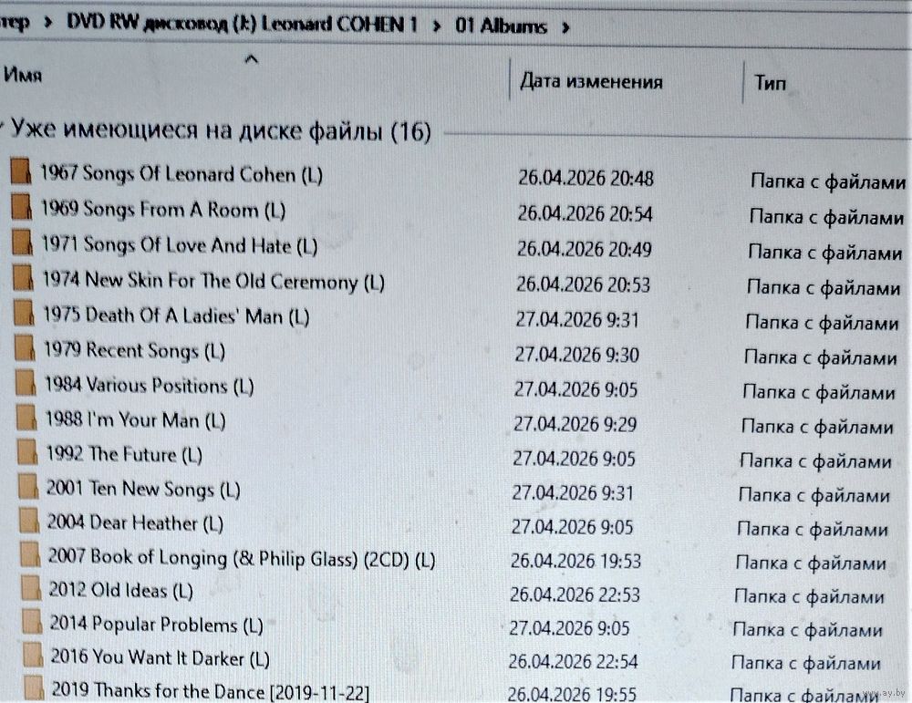 Контент см. фото конверта. При наличии таковых в треки вшиты обложки альбомов. Качество 320 kbps (если напротив названия альбома не указано иное). Покупателям, совершившим покупки на сумму от 50 до 100 руб. скидка 5%, от 101 до 200 руб. - 10%, более 201 руб. - 20%. Заказы на сумму менее 5 руб. с 2024 г. не высылаю. Ознакомиться с творчеством можно здесь: https://musify.club/artist/leonard-cohen-18560/discography