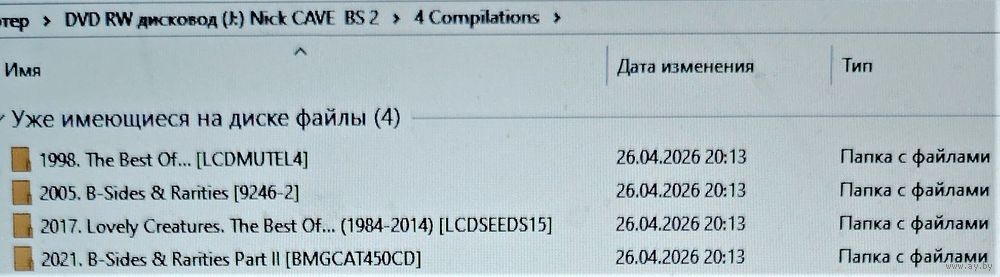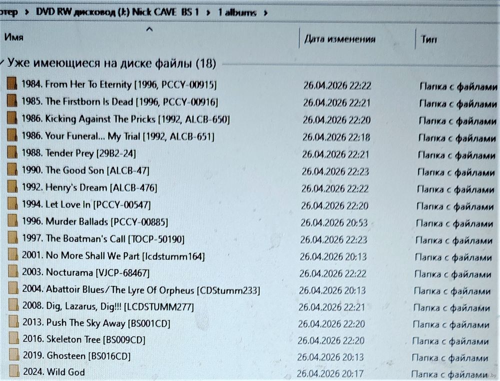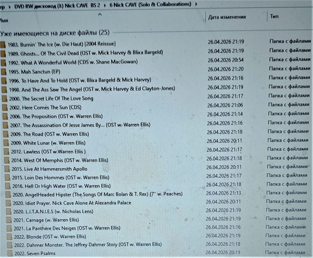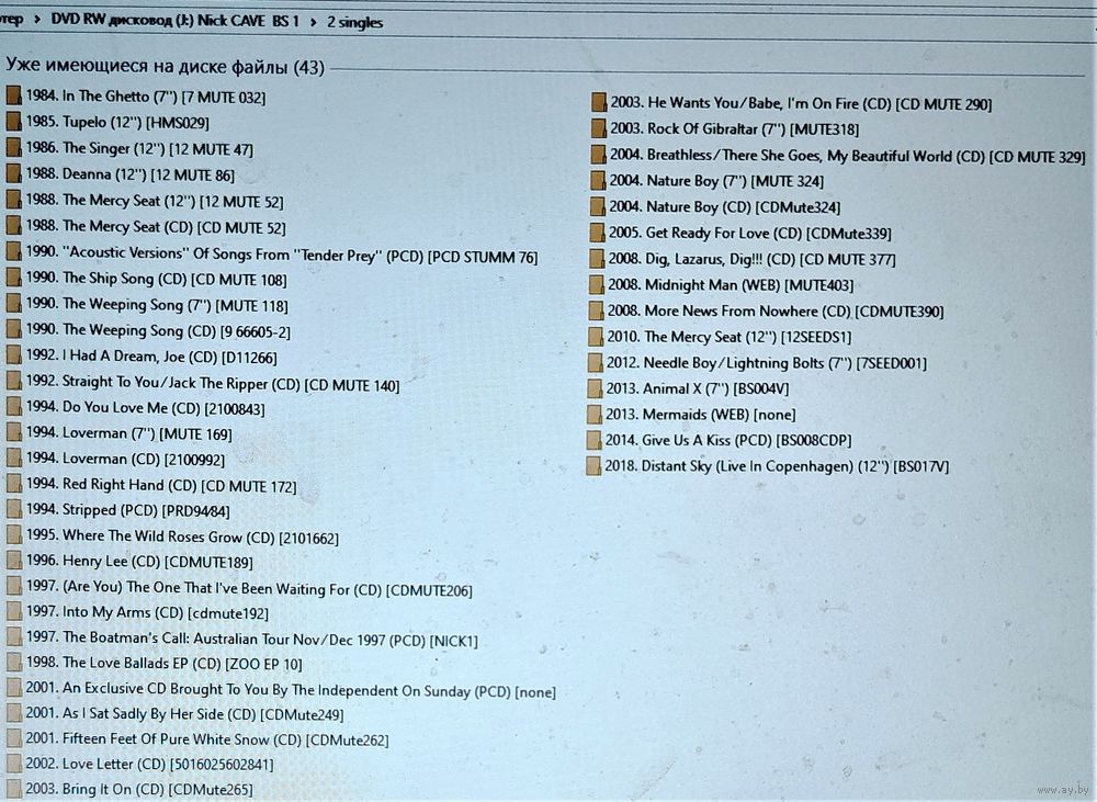 Контент см. фото конверта. При наличии таковых в треки вшиты обложки альбомов. Качество 320 kbps (если напротив названия альбома не указано иное). Покупателям, совершившим покупки на сумму от 50 до 100 руб. скидка 5%, от 101 до 200 руб. - 10%, более 201 руб. - 20%. Заказы на сумму менее 5 руб. с 2024 г. не высылаю. Ознакомиться с творчеством можно здесь: https://musify.club/artist/nick-cave-and-the-bad-seeds-1982/discography; https://musify.club/artist/nick-cave-198548/discography