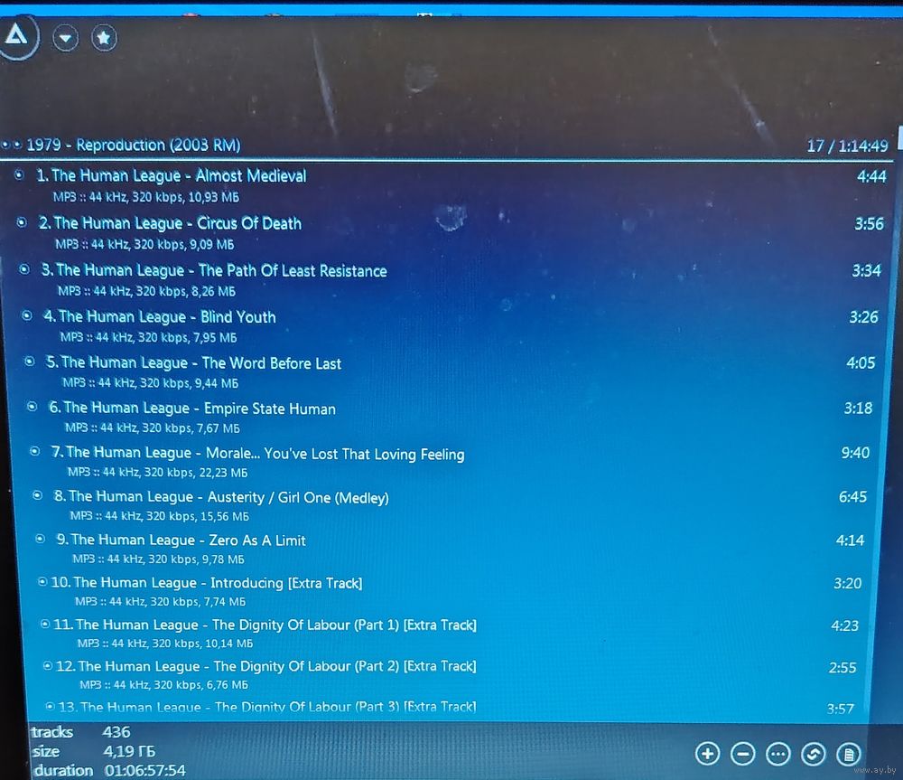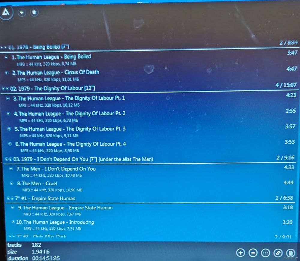 Контент см. фото конверта и скриншотов с экрана. При наличии таковых в треки вшиты обложки альбомов. Качество 320 kbps (если напротив названия альбома не указано иное). Покупателям, совершившим покупки на сумму от 50 до 100 руб. скидка 5%, от 101 до 200 руб. - 10%, более 201 руб. - 20%. Заказы на сумму менее 5 руб. с 2024 г. не высылаю. Ознакомиться с творчеством можно здесь: https://musify.club/artist/the-human-league-16014/discography