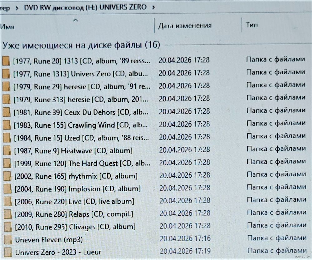 Контент см. фото конверта. При наличии таковых в треки вшиты обложки альбомов. Качество 320 kbps (если напротив названия альбома не указано иное). Покупателям, совершившим покупки на сумму от 50 до 100 руб. скидка 5%, от 101 до 200 руб. - 10%, более 201 руб. - 20%. Заказы на сумму менее 5 руб. с 2024 г. не высылаю. Ознакомиться с творчеством можно здесь: https://musify.club/artist/univers-zero-39308/discography