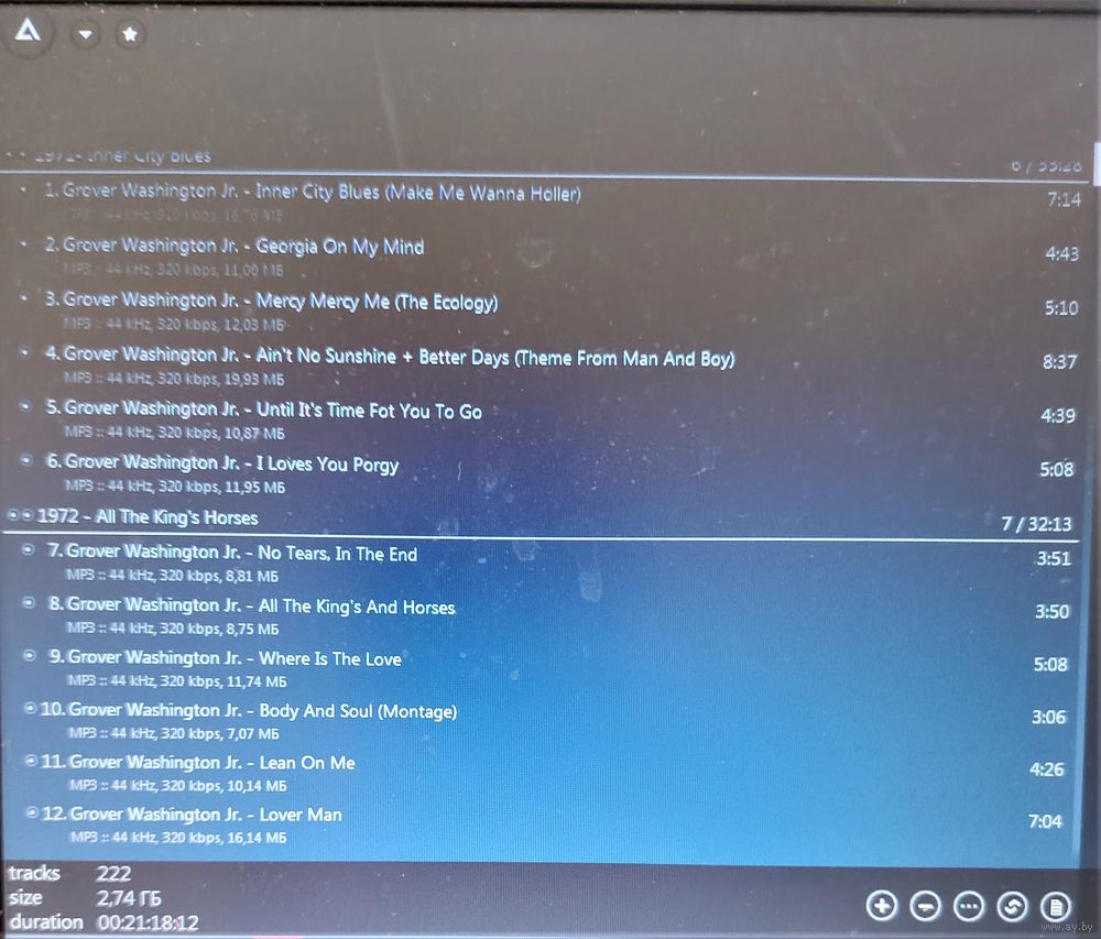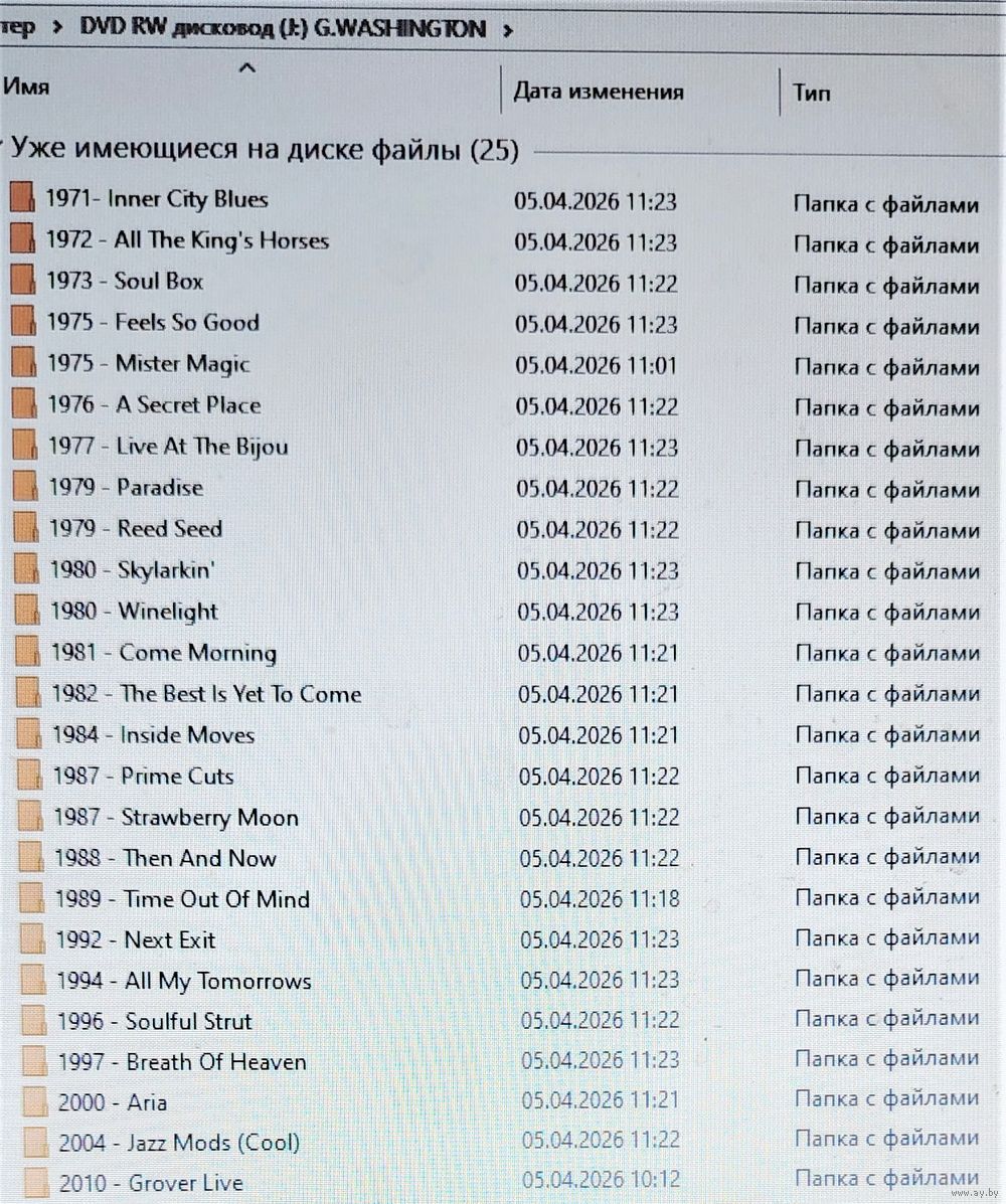 Контент - см. фото конвертов. Скриншоты проверки на считываемость также представлены на фото. Качество 320 kbps (если напротив названия альбома не указано иное). Ознакомиться с творчеством можно здесь: https://musify.club/artist/grover-washington-jr-42515/discography