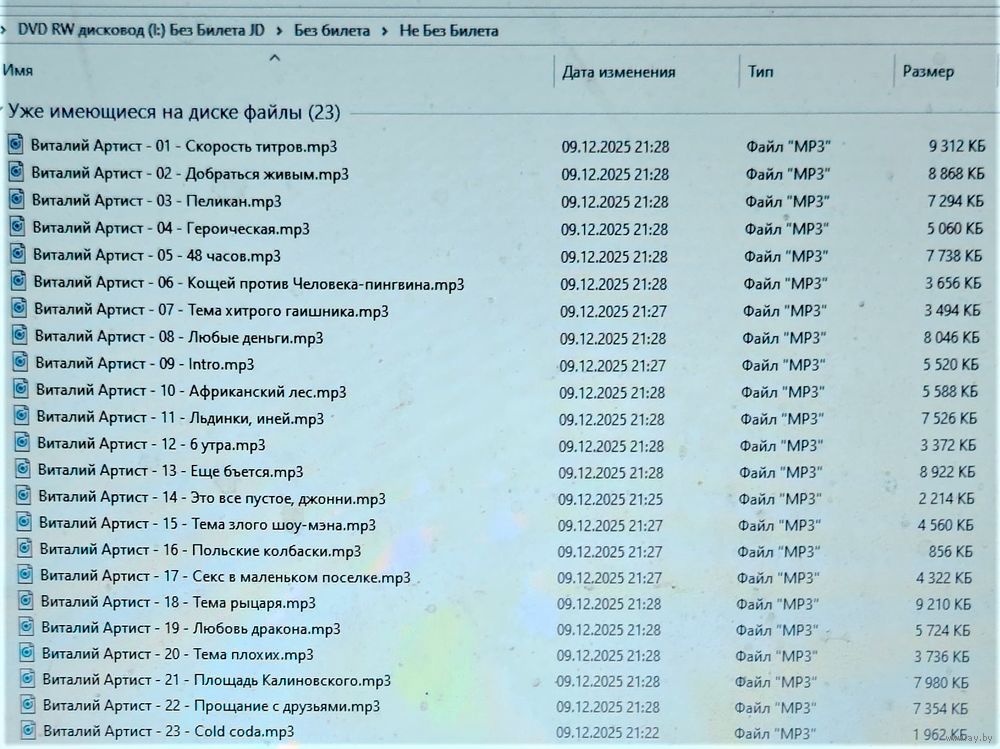 Контент см. фото конверта и скриншотов с экрана. При наличии таковых в треки вшиты обложки альбомов. Качество 320 kbps (если напротив названия альбома не указано иное). Покупателям, совершившим покупки на сумму от 50 до 100 руб. скидка 5%, от 101 до 200 руб. - 10%, более 201 руб. - 20%. Заказы на сумму менее 5 руб. с 2024 г. не высылаю. Ознакомиться с творчеством можно здесь: https://musify.club/artist/jah-division-86702/discography: https://musify.club/artist/gerbert-morales-462069/discography; https://musify.club/artist/bez-bileta-100155/discography; https://musify.club/release/vitalii-artist-igla-2020-1393415