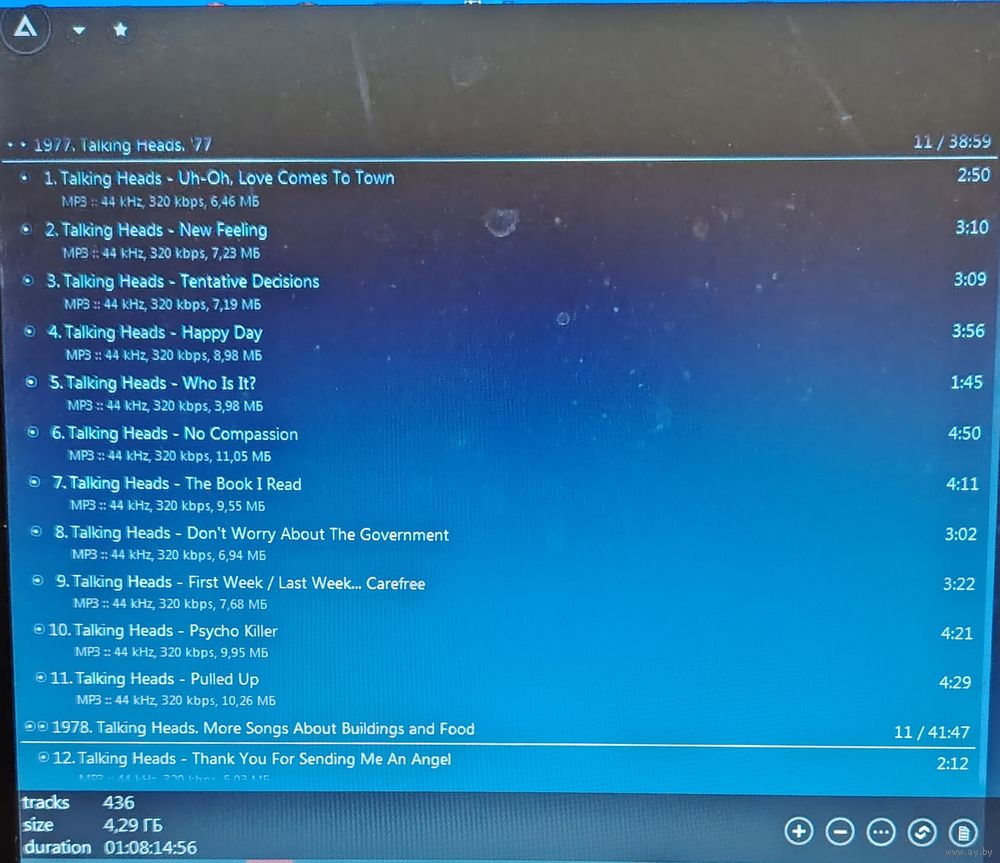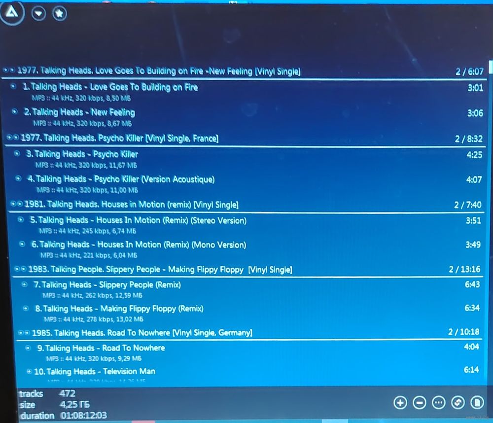 Контент см. фото конверта и скриншотов с экрана. При наличии таковых в треки вшиты обложки альбомов. Качество 320 kbps (если напротив названия альбома не указано иное). Покупателям, совершившим покупки на сумму от 50 до 100 руб. скидка 5%, от 101 до 200 руб. - 10%, более 201 руб. - 20%. Заказы на сумму менее 5 руб. с 2024 г. не высылаю. Ознакомиться с творчеством можно здесь: https://musify.club/artist/talking-heads-5894/discography