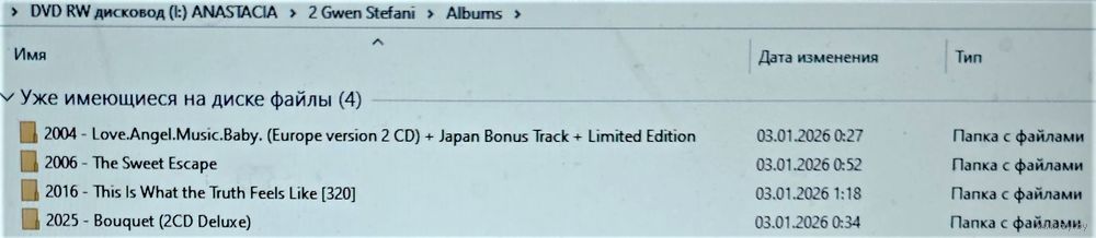 Ознакомиться с творчеством можно здесь: https://musify.club/artist/anastacia-usa-12/discography; https://musify.club/artist/gwen-stefani-569/discography; https://musify.club/artist/no-doubt-136/discography