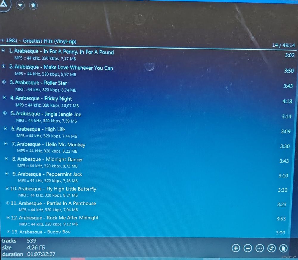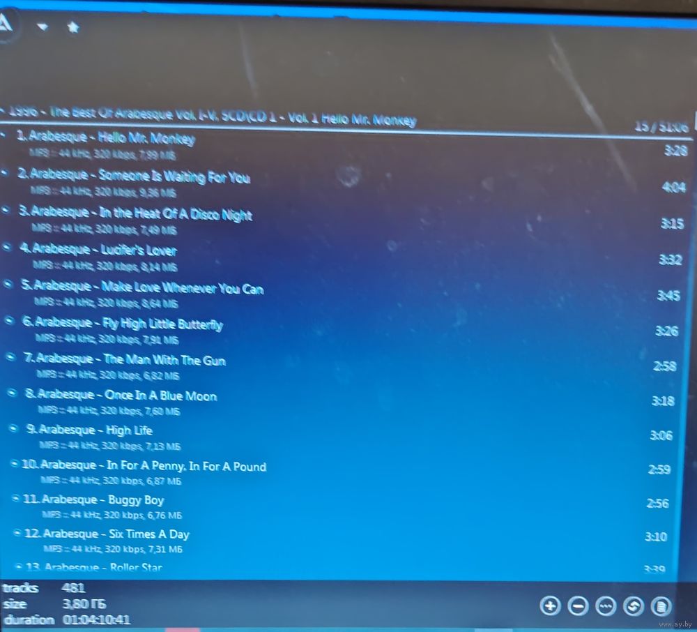 Уважаемые потенциальные покупатели, посетители данного аукциона и просто хорошие люди, случайно открывшие данную страничку! Возможно, начальная цена на данный лот покажется Вам слишком высокой, но тому есть несколько причин: 1) качественно записать DVD MP3 диск не так просто, как может показаться на первый взгляд - подбор контента, тщательная проверка и редактирование файлов и папок, правильный подбор файловой системы для того, чтобы диск воспроизводился на всех устройствах, поддерживающих DVD формат и многие другие нюансы; 2) в последнее время стоимость чистых DVD-R дисков значительно возросла; 3) выставляя лот, я даю 100% гарантию читаемости данного диска, что подтверждается строкой AIMP плеера, который никогда не выдаст конечный результат (общее время, количество треков и занимаемое место музыкальными файлами на диске), если хотя бы один файл во время сканирования либо не считался, либо "подвис". Надеюсь на Ваше понимание.