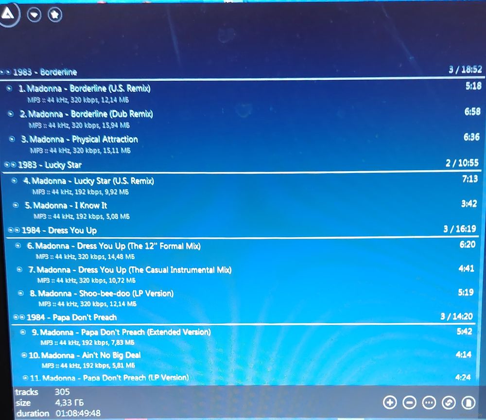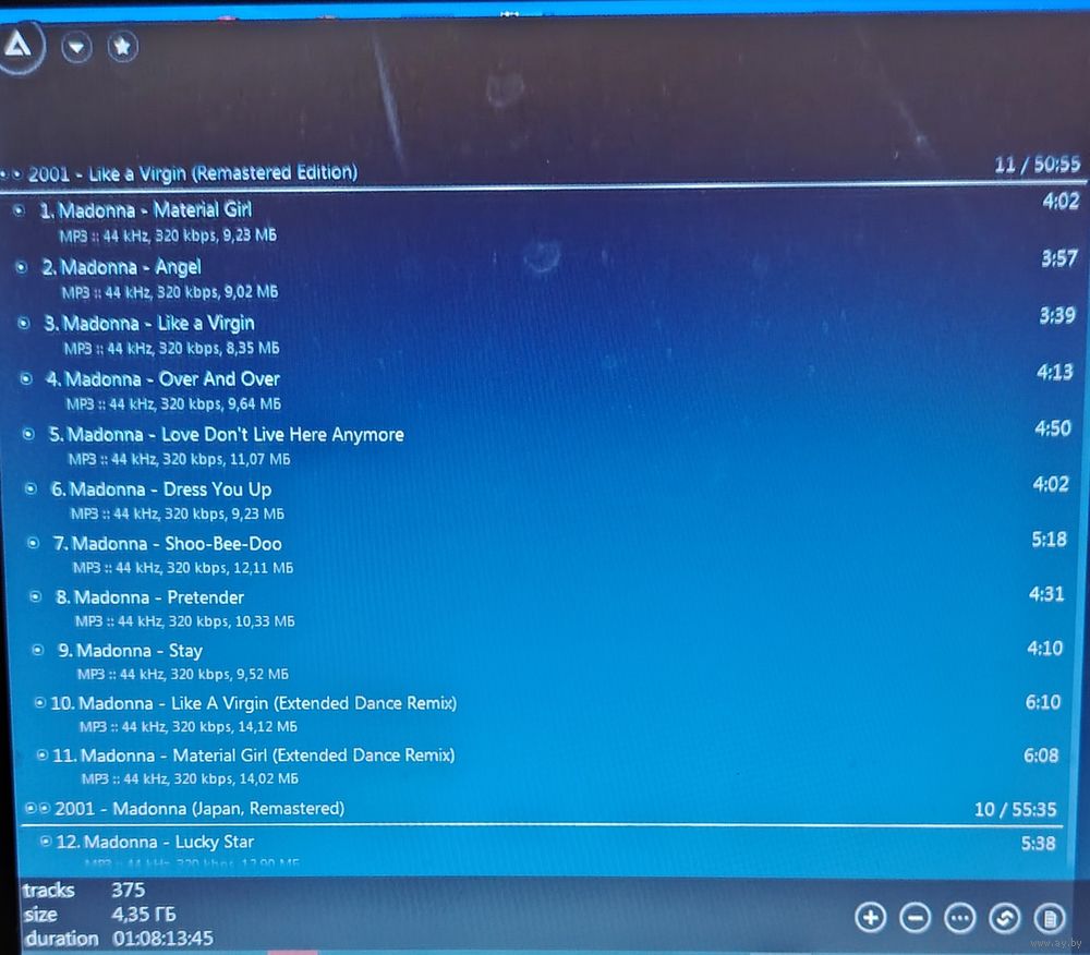 Уважаемые потенциальные покупатели, посетители данного аукциона и просто хорошие люди, случайно открывшие данную страничку! Возможно, начальная цена на данный лот покажется Вам слишком высокой, но тому есть несколько причин: 1) качественно записать DVD MP3 диск не так просто, как может показаться на первый взгляд - подбор контента, тщательная проверка и редактирование файлов и папок, правильный подбор файловой системы для того, чтобы диск воспроизводился на всех устройствах, поддерживающих DVD формат и многие другие нюансы; 2) в последнее время стоимость чистых DVD-R дисков значительно возросла; 3) выставляя лот, я даю 100% гарантию читаемости данного диска, что подтверждается строкой AIMP плеера, который никогда не выдаст конечный результат (общее время, количество треков и занимаемое место музыкальными файлами на диске), если хотя бы один файл во время сканирования либо не считался, либо "подвис". Надеюсь на Ваше понимание.