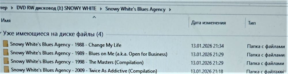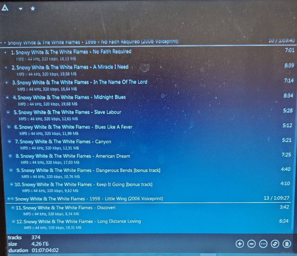 При наличии таковых в треки вшиты обложки альбомов. Качество 320 kbps (если напротив названия альбома не указано иное). Покупателям, совершившим покупки на сумму от 50 до 100 руб. скидка 5%, от 101 до 200 руб. - 10%, более 201 руб. - 20%. Заказы на сумму менее 5 руб. с 2024 г. не высылаю. Ознакомиться с творчеством можно здесь: https://musify.club/artist/snowy-white-6043; https://musify.club/artist/snowy-white-and-the-white-flames-75590/discography; https://musify.club/artist/the-snowy-white-blues-project-509938/discography