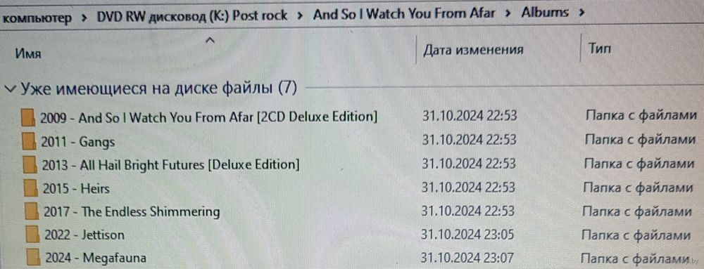 Контент см. фото конверта и скриншотов с экрана. При наличии таковых в треки вшиты обложки альбомов. Качество 320 kbps (если напротив названия альбома не указано иное). Покупателям, совершившим покупки на сумму от 50 до 100 руб. скидка 5%, от 101 до 200 руб. - 10%, более 201 руб. - 20%. Заказы на сумму менее 5 руб. с 2024 г. не высылаю. Ознакомиться с творчеством можно здесь: https://musify.club/artist/and-so-i-watch-you-from-afar-33653/releases; https://musify.club/artist/coastlands-188005/releases; https://musify.club/artist/dead-sea-apes-330402/releases;