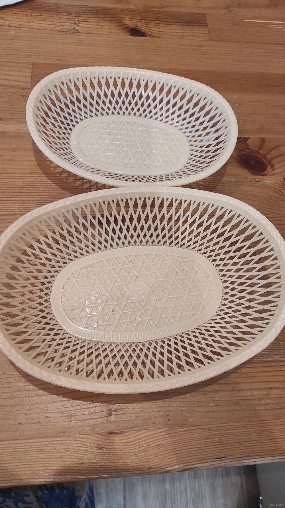 Две корзинки овал, цвет бежевый, пластик. Размеры: 1 (24,5 на 17 см), 2 (20 на 14 см). Продаю парой. Хорошее состояние.