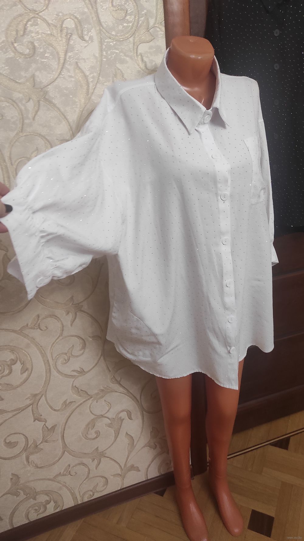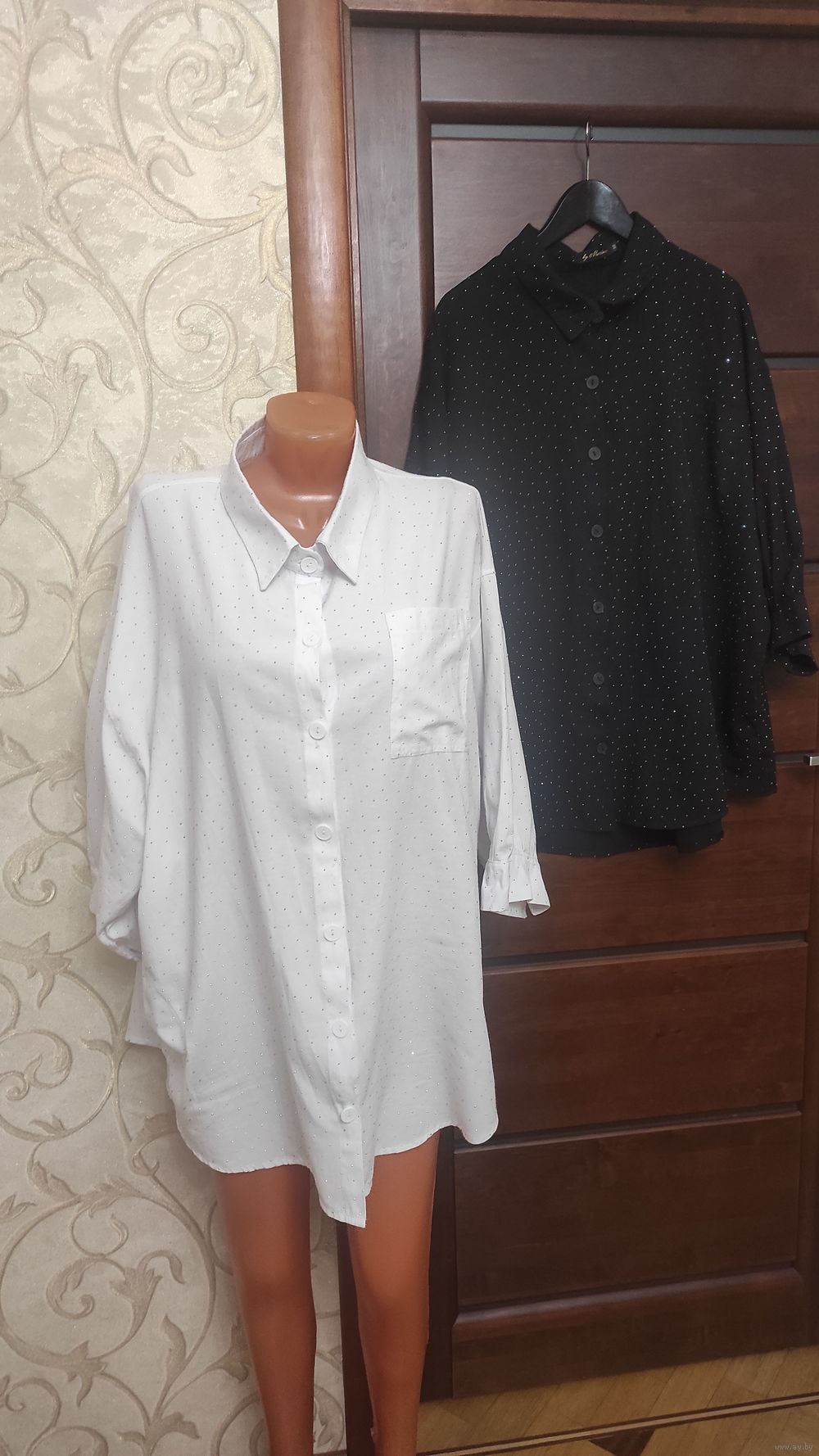 Две стильных рубашки на 66-68 размер. Черная и белая, красиво и красиво мерцают, сидит отлично на фигуре, носила мало, по случаю. Хлопок, очень приятные на ощупь, комфортно сидит на фигуре, ничего не пережимает, классный рукав. Состояние хорошее. Цена указана за штуку.