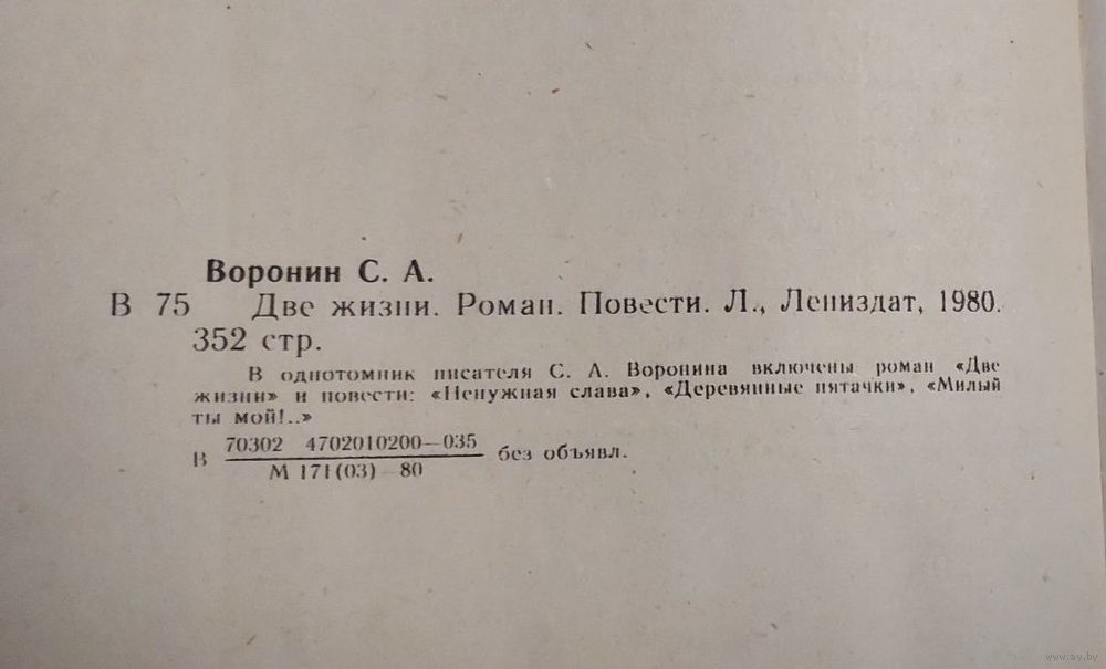 В однотомник писателя С. А. Воронина включены роман "Две жизни" и повести: "Ненужная слава", "Деревянные пятачки", "Милый ты мой!..."