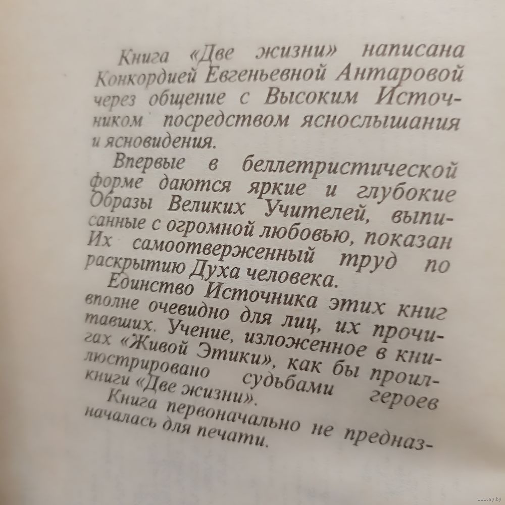 Книга `Две жизни` записана Конкордией Евгеньевной Антаровой через общение с действительным Автором посредством яснослышания способом, которым записали книги `Живой Этики` Е. И. Рерих и Н. К. Рерих, `Тайную Доктрину` - Е. П. Блаватская. Единство Источника этих книг вполне очевидно для лиц, их прочитавших. Учение, изложенное в книгах `Живой Этики`, как бы проиллюстрировано судьбами героев книги `Две жизни`. Это тот же Источник Единой Истины, из которого вышли Учения Гаутамы Будды, Иисуса Христа и других Великих Учителей. Впервые в книге, предназначенной для широкого круга читателей, даются яркие и глубокие Образы Великих Учителей, выписанные с огромной любовью, показан Их самоотверженный труд по раскрытию Духа человека. Книга, первоначально предназначавшаяся для очень узкого круга учеников, получавших через К. Е. Антарову руководство Великих Учителей