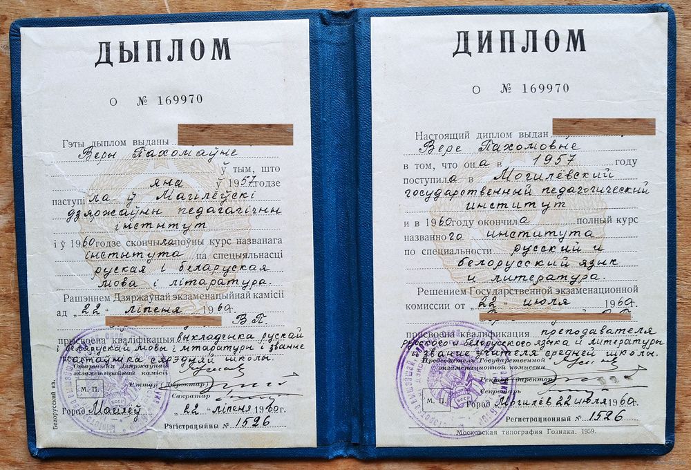Дыплом аб заканчэннi Магілеўскага педагагiчнага iнстытута. (Диплом об окончании Могилевского пединститута). 1960 г.