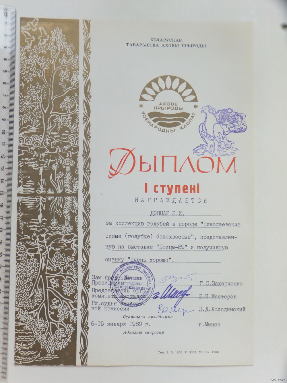 Дыплом таварыства аховы прыроды БССР 1989