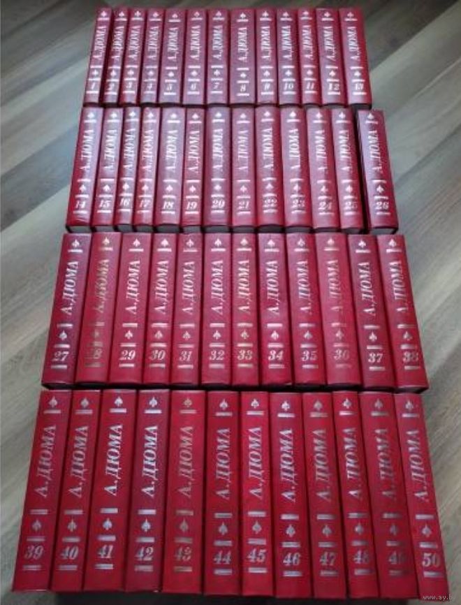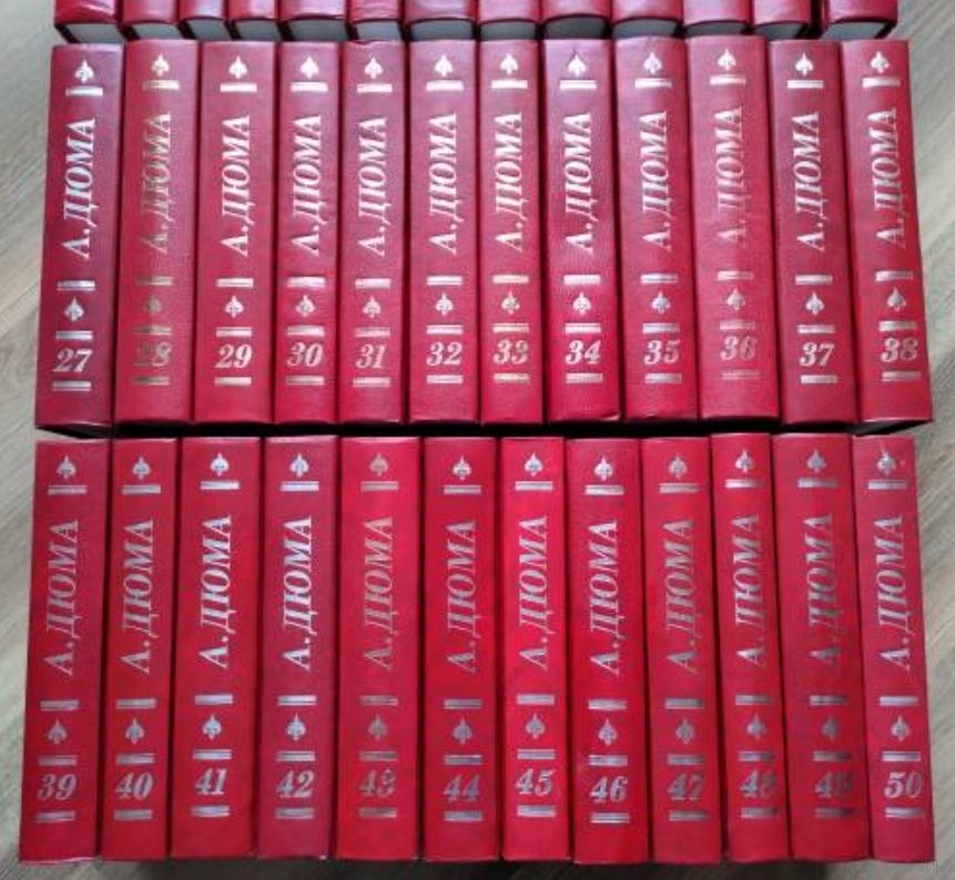 Дюма А. Собрание сочинений в пятидесяти томах (красное). Тома 1-50. Москва, Арт-Бизнес-Центр, 1992-2001 гг. Твёрдый переплет. Обычный формат. Чёрно-белые иллюстрации.