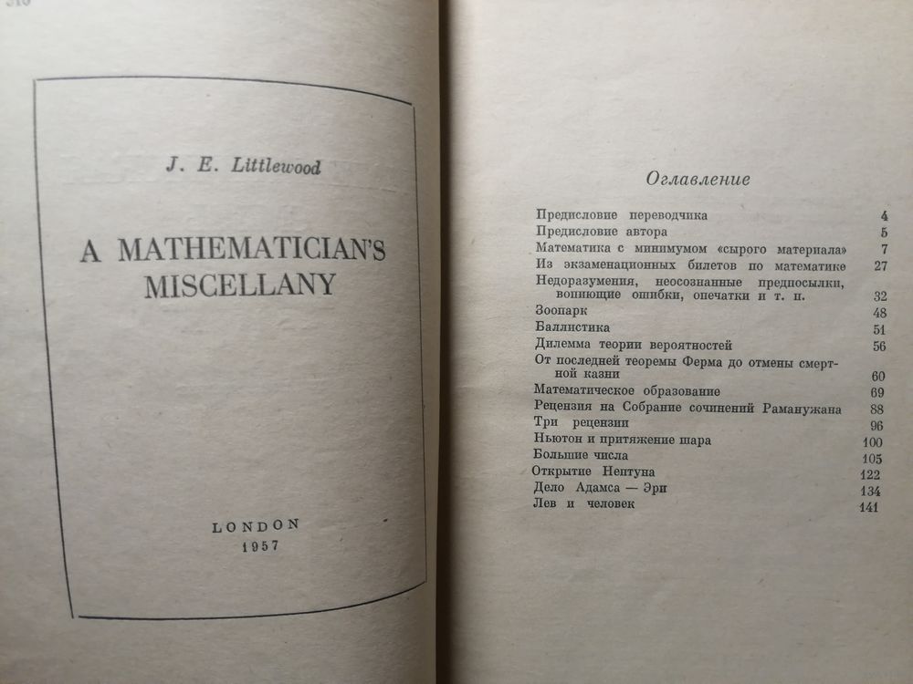 В своей книге английский математик Джон Литлвуд предлагает читателю несколько очерков-новелл, посвященных различным математическим вопросам. Тематика очерков весьма разнообразна. Среди них имеются автобиографические заметки, небольшие историко-математические исследования, элементарное (или близкое к элементарному) рассмотрение вопросов, для изучения которых обычно привлекается аппарат высшее математики, популярное обсуждение некоторых принципиальных вопросов, рецензии, рассмотрение некоторых специальных вопросов, иногда доступное только для математиков. Отталкиваясь всякий раз от математики, автор иногда приходит к проблемам, далеким от нее. Обсуждение таких проблем подчас носит непринужденный, шутливый характер.
