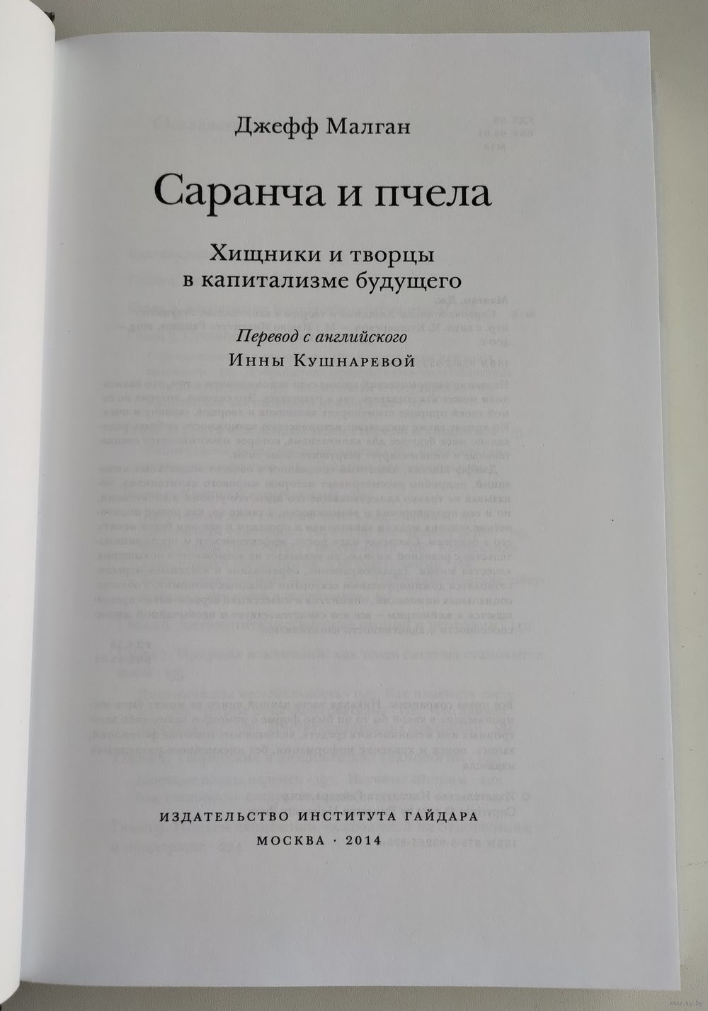 Малган, Дж. Саранча и пчела: Хищники и творцы в капитализме будущего / пер. с англ. И. Кушнаревой. — М.: Изд-во Института Гайдара, 2014. — 400 с. Твёрдый переплёт, обычный формат.