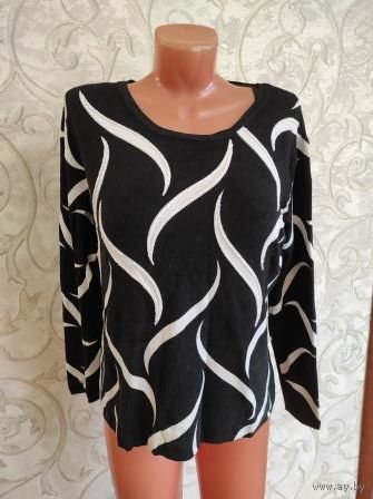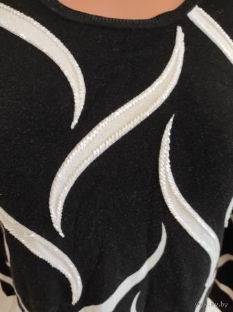 Джемпер на 50-52 размер, плотный трикотаж, черный с белыми полосками, с бисером. Б/у, есть катышки, в одном месте бисер распустился, дальше не идет. Длина 58 см, длина рукава 54 см, ПОгруди 51 см, хорошо тянется. В общем нормальное состояние.