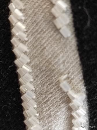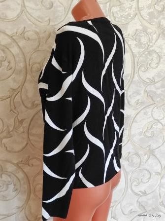 Джемпер на 50-52 размер, плотный трикотаж, черный с белыми полосками, с бисером. Б/у, есть катышки, в одном месте бисер распустился, дальше не идет. Длина 58 см, длина рукава 54 см, ПОгруди 51 см, хорошо тянется. В общем нормальное состояние.
