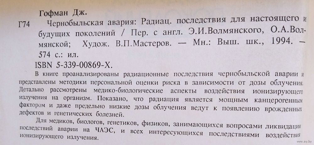 Джон Гофман. Чернобыльская авария: радиационные последствия для настоящего и будущих поколений. Автограф переводчика. Минск : Вышэйшая школа, 1994 г. 574 с. Мягкая обложка.