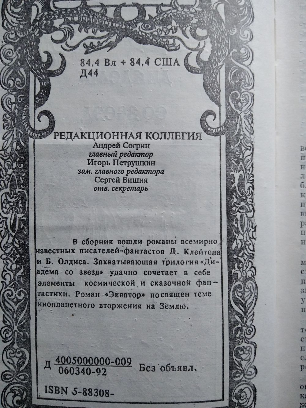 В сборник вошли романы всемирно известных писателей-фантастов Д.Клейтона и Б.Олдисса. Захватывающая трилогия "Диадема со звезд"(Д.Клейтон) удачно сочетает в себе элементы космической и сказочной фантастики. Роман "Экватор" (Б.Олдисс) посвящен теме инопланетного вторжения на Землю.