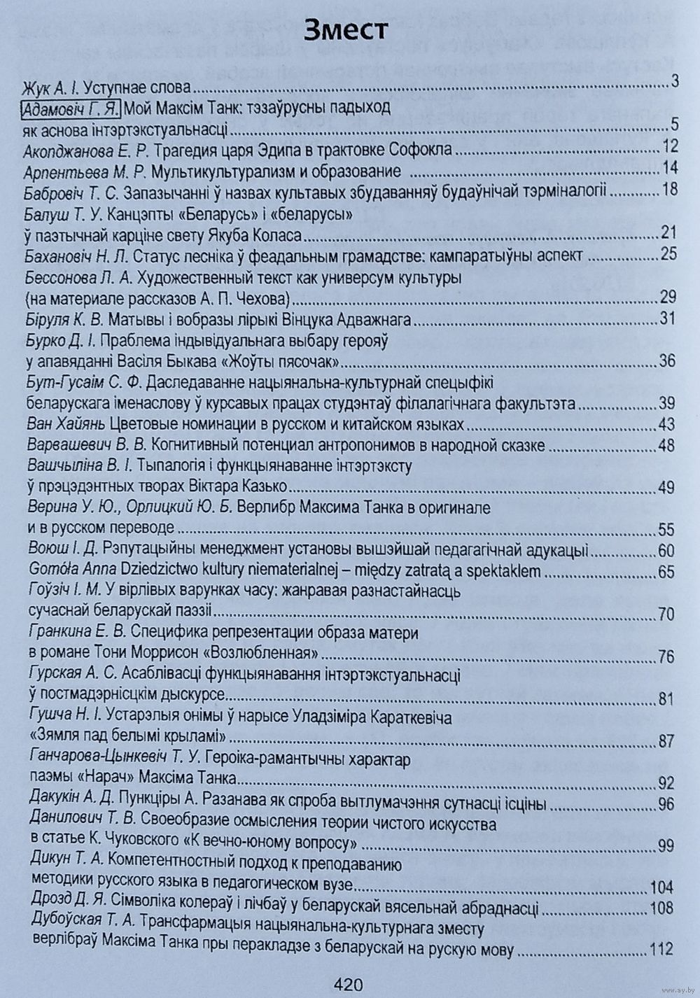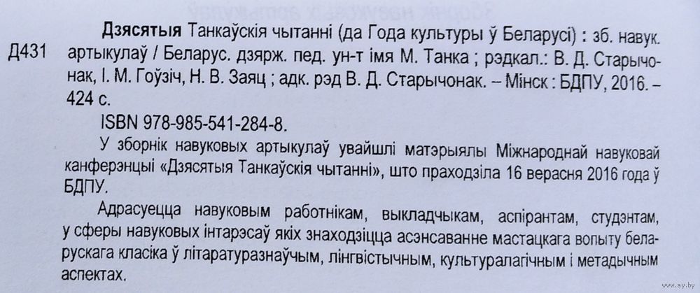 Дзясятыя Танкаўскія чытанні: зборнік навуковых артыкулаў: матэрыялы Міжнароднай навуковай канферэнцыі, 16 верасня 2016 г., г. Мінск. Рэдкалегія: В. Д. Старычонак (адказны рэдактар), І. М. Гоўзіч, Н. В. Заяц. - Мінск : БДПУ, 2016 г. 423 с. Мяккая вокладка.