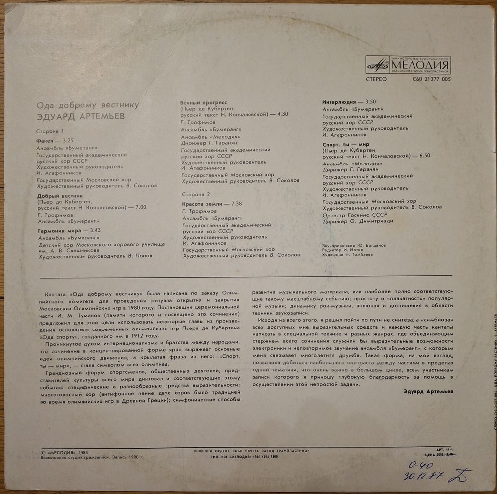 Э. Артемьев. Ода доброму вестнику.