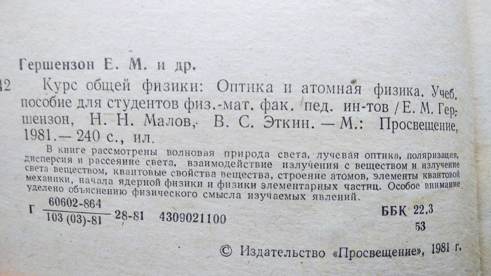 В книге рассмотрены волновая природа света, лучевая оптика, поляризация, дисперсия и рассеяние света, взаимодействие излучения с веществом и излучение света веществом, квантовые свойства вещества, строение атомов, элементы квантовой механики, начала ядерной физики и физики элементарных частиц. Особое внимание уделено объяснению физического смысла изучаемых явлений.