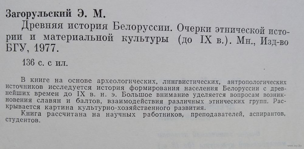 Э. М. Загорульский. Древняя история Белоруссии: очерки этнической истории и материальной культуры (до IX в.) Минск : Издательство БГУ, 1977 г. 133 с. Твердый переплет. Увеличенный формат. Суперобложка.