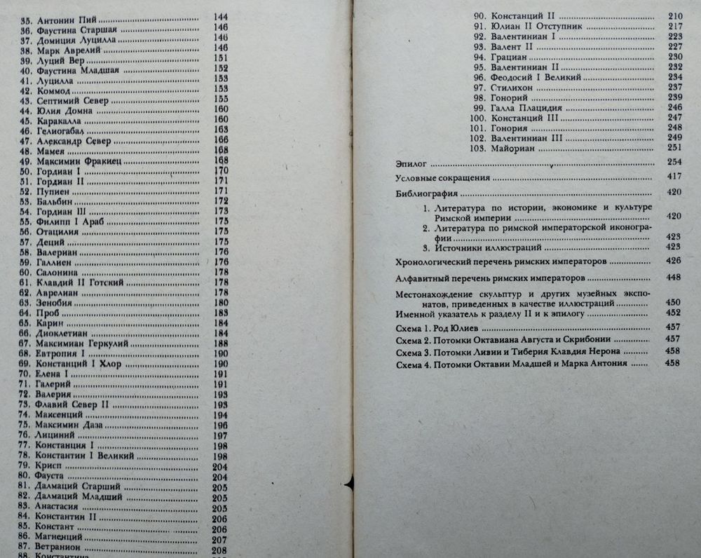 Включает 103 биографии императоров и членов их семей. Библиография. Алфавитный и хронологический перечни римских императоров. Местонахождение скульптур и других музейных экспонатов,приведенных в качестве иллюстраций. Генеалогические схемы. Обширный иллюстративный материал - около 150 фотографий в отдельном альбоме в конце книги.Москва, 1979