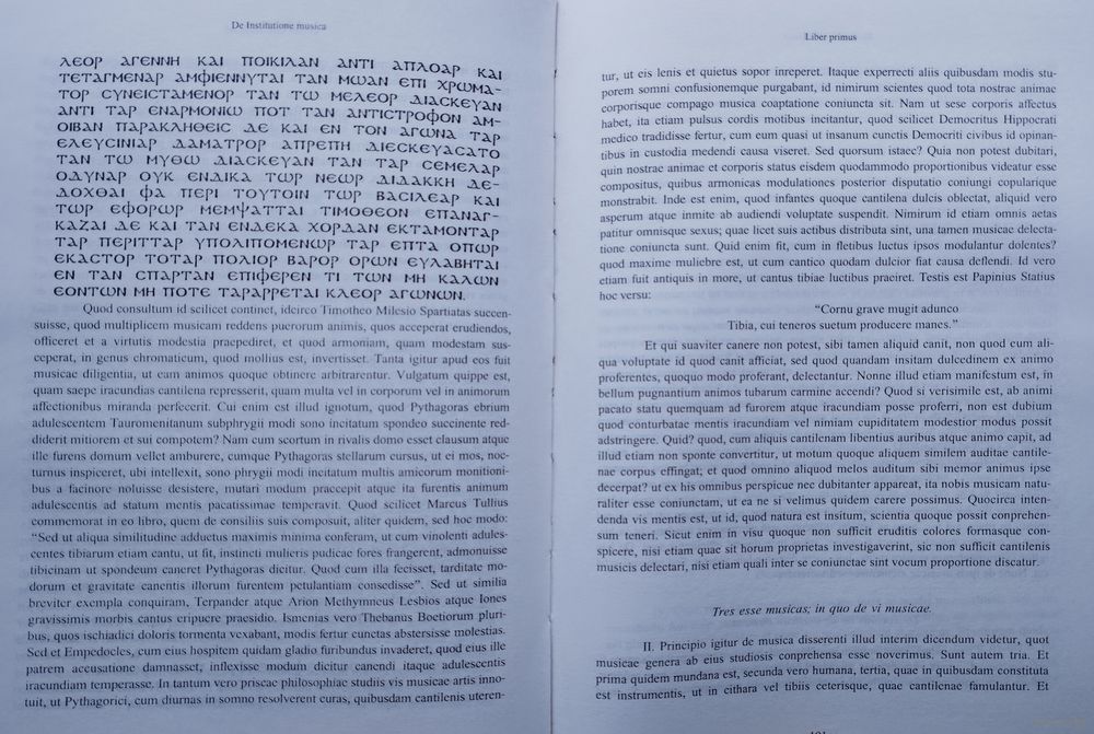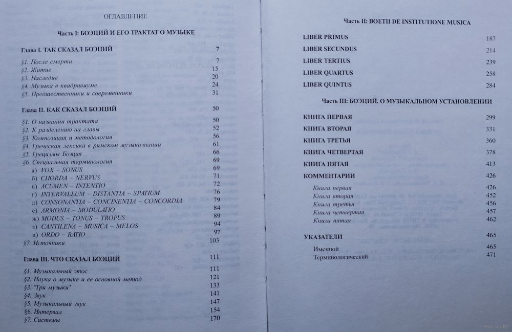 Большой энциклопедический формат. Ляссе. Тираж 3000 экз.480 стр. Книга состоит из трех частей. В первой части излагаются сведения о жизни и творчестве Аниция Манлия Торквата Северина Боэция (480-525), знаменитого позднеантичного философа. Описывается судьба его сочинения о музыке - "De institutione musica", которое подвело итоги многовековому развитию античного музыкознания. Подробно освещаются воззрения Боэция на все аспекты музыки, разбираются терминологические проблемы. Вторая часть книги - латинский текст "De institutione musica". Третья часть - первый перевод на русский язык знаменитого трактата Боэция.