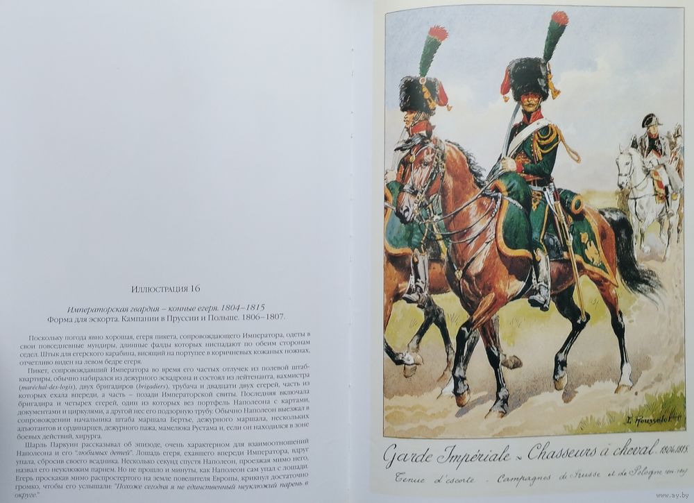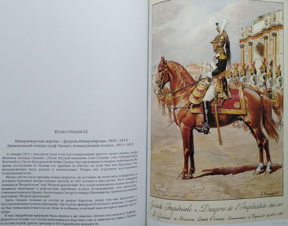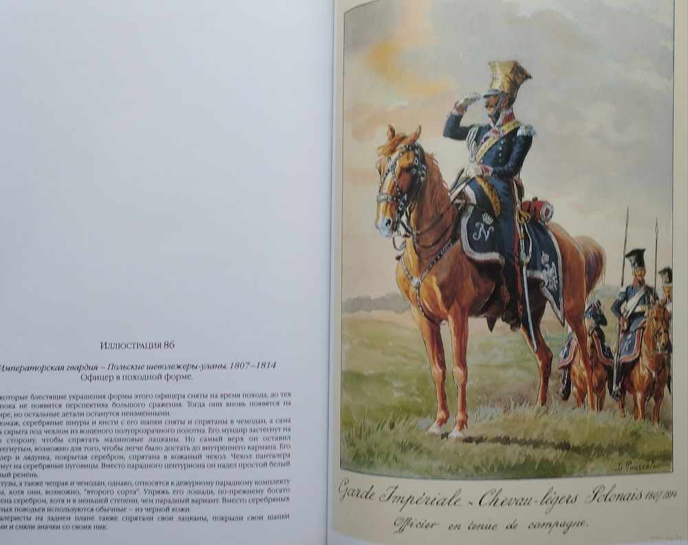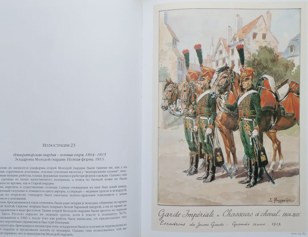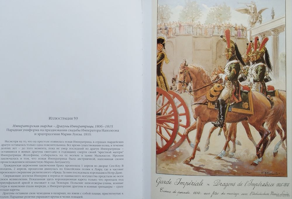 Отпечатано в Латвии. Большой энциклопедический формат. Мелованный альбом. Ляссе. Тираж 500 экз. 208 стр. Уникальная коллекция цветных иллюстраций отражает дух Императорской гвардейской кавалерии, и ту огромную роль, которую она сыграла в наполеоновских сражениях.